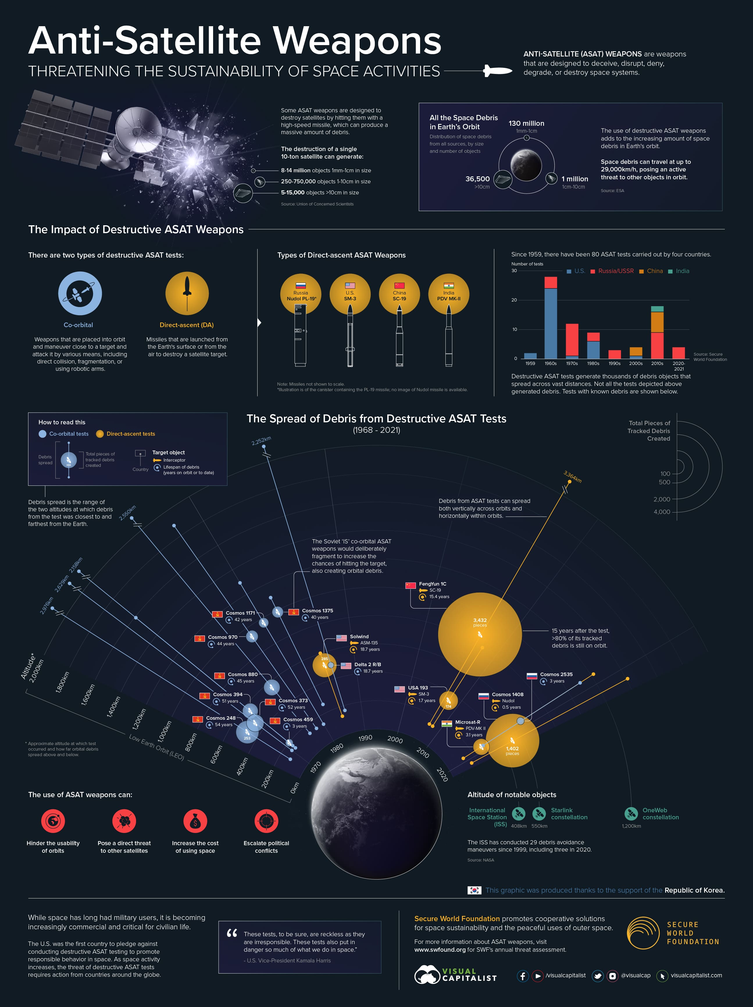 λλ€. VISUAL CAPITALISTκ° μ Secure World Foundationμ μλ£λ₯Ό λ°νμΌλ‘ μ 리ν μ΄ μΈν¬κ·Έλν½μ κ°κ΅μ λμμ± λ¬΄κΈ°λ€μ΄ μ΄λ»κ² κ°λ°λκ³ μκ³ μλνλμ§λ₯Ό μκ°νκ³ μλλ°μ. μ°μ£Ό κ°λ° μμ²΄κ° μμ§μ μμμ λλΌμ μν΄ μ£Όλλκ³ μλ λ§νΌ λμμ± λ¬΄κΈ°μ κ°λ°λ λ¬μμ, μ€κ΅, λ―Έκ΅, μΈλμ 4κ°κ΅λ§ μ±κ³΅νλ€κ³ νλλ°μ.