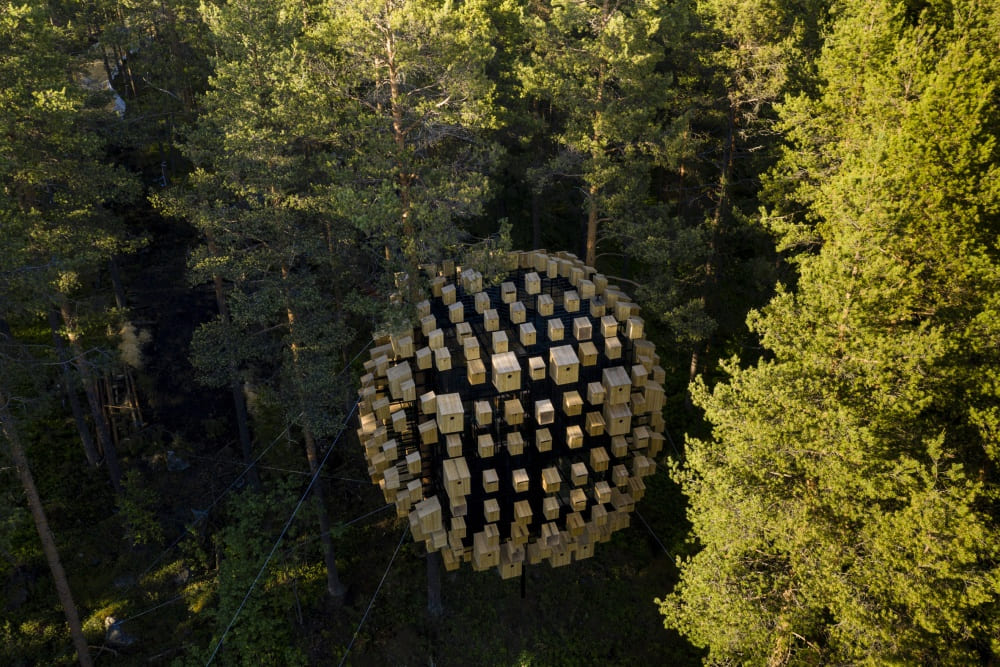 Danish architecture studio BIG has revealed its Biosphere treehouse at the Treehotel in Swedish Lapland, which is surrounded by birdhouses.