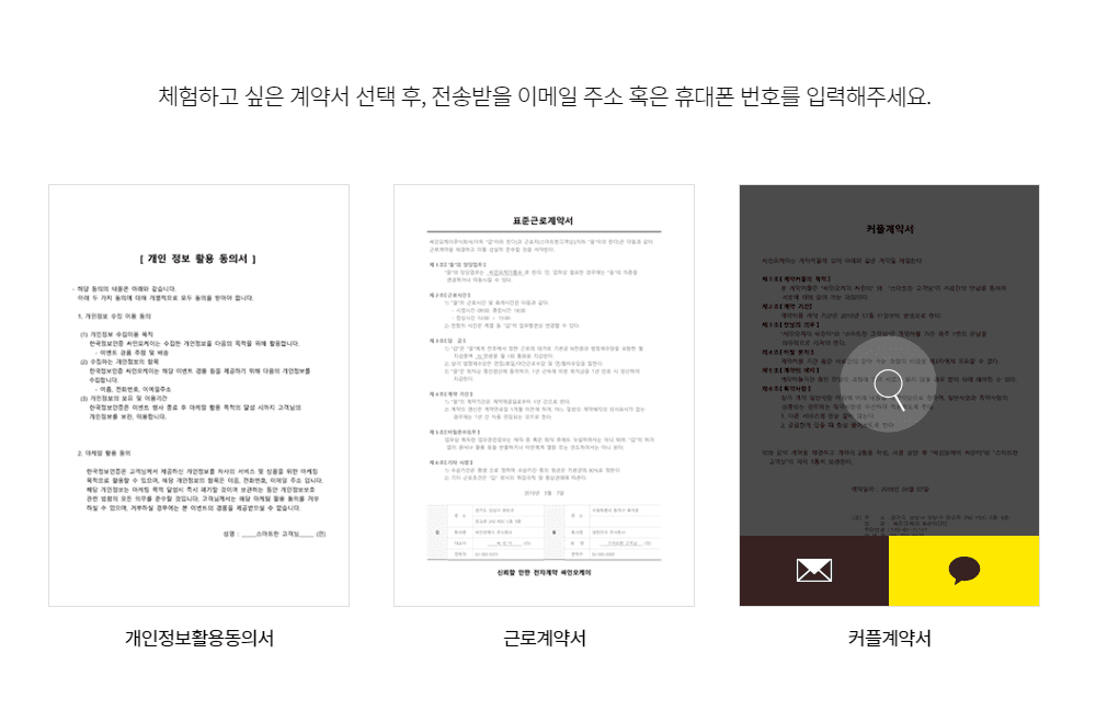 μ 곡λλ μμ μ€ νλμΈ μ μ κ·Όλ‘κ³μ½μλ₯Ό ν μ€νΈ μΌμ μ μ μλͺ ν΄λ³Έ 건λ°μ. κ·Όλ‘κ³μ½μλ₯Ό κ³ λ₯΄κ³ κ³μ½μλ₯Ό λ°μ μ΄λ©μΌμ΄λ μΉ΄ν‘ λ©μμ§ λ°μ‘μ μν μ νλ²νΈλ₯Ό μ λ ₯νλ©΄ 체νμ΄ μμλλκ΅°μ. μ λ μ΄λ©μΌλ‘ λ°μλ³΄κΈ°λ‘ νμ§λ§, μΉ΄ν‘μΌλ‘ ν μ€νΈν΄λ³΄μ λ νΈλ¦¬νμ€ κ±°μμ. μ§μ₯μΈμ΄λΌλ©΄ λꡬλ μ΄ν΄νκ³ μ¬μ©ν μ μμ μ λλ‘ μ¬μ΄ UIλ₯Ό κ°μ‘°ν λ§νΌ μλ΄λλ‘λ§ νλ©΄ μμ μ μ μλͺ μ΄ μ§νλλλΌκ³ μ. 체ν μ μ² μ§ν λ°λ‘ μ΄λ©μΌλ‘ μ μ κ·Όλ‘κ³μ½μκ° λμ°©ν©λλ€.