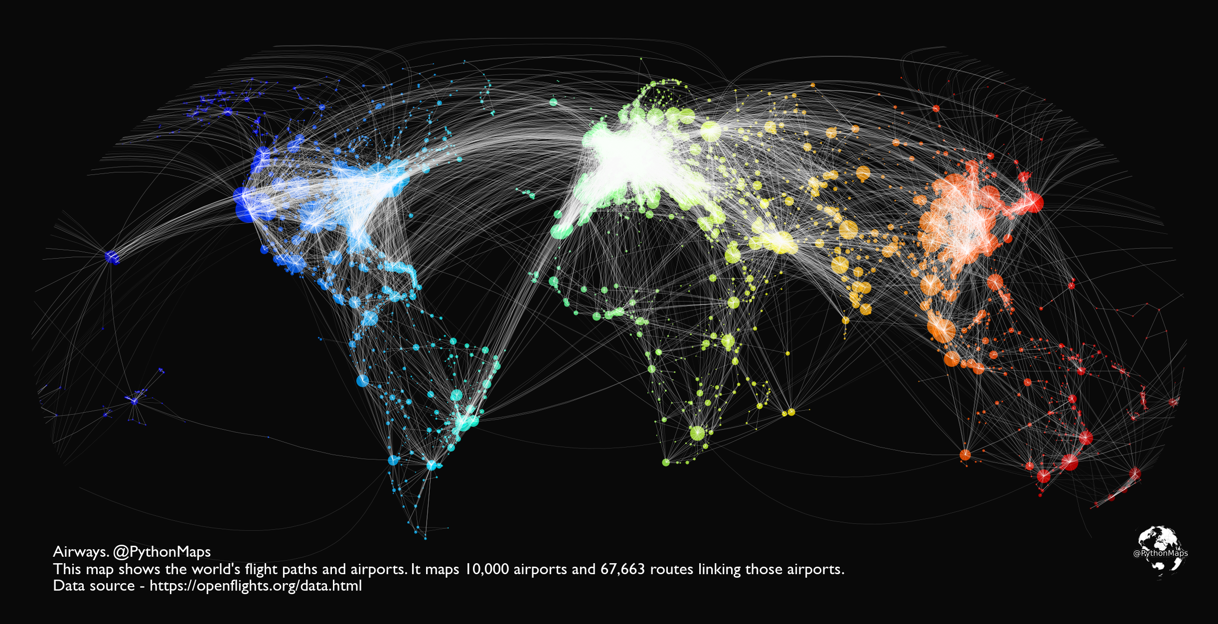 This map shows over 65,000 of the world’s flight paths and the various airports that each route connects, using data from Open Flights.