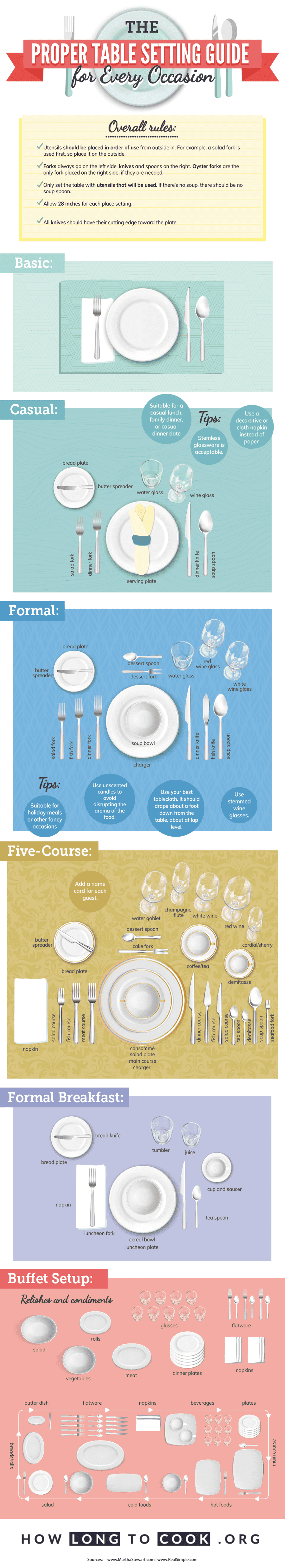 The Proper Table Setting Guide for Every Occasion Whether you are having an elegant dinner party, casual breakfast, romantic date, or lively family buffet, setting a table properly can truly elevate the experience. The team at HowLongtoCook.org has created