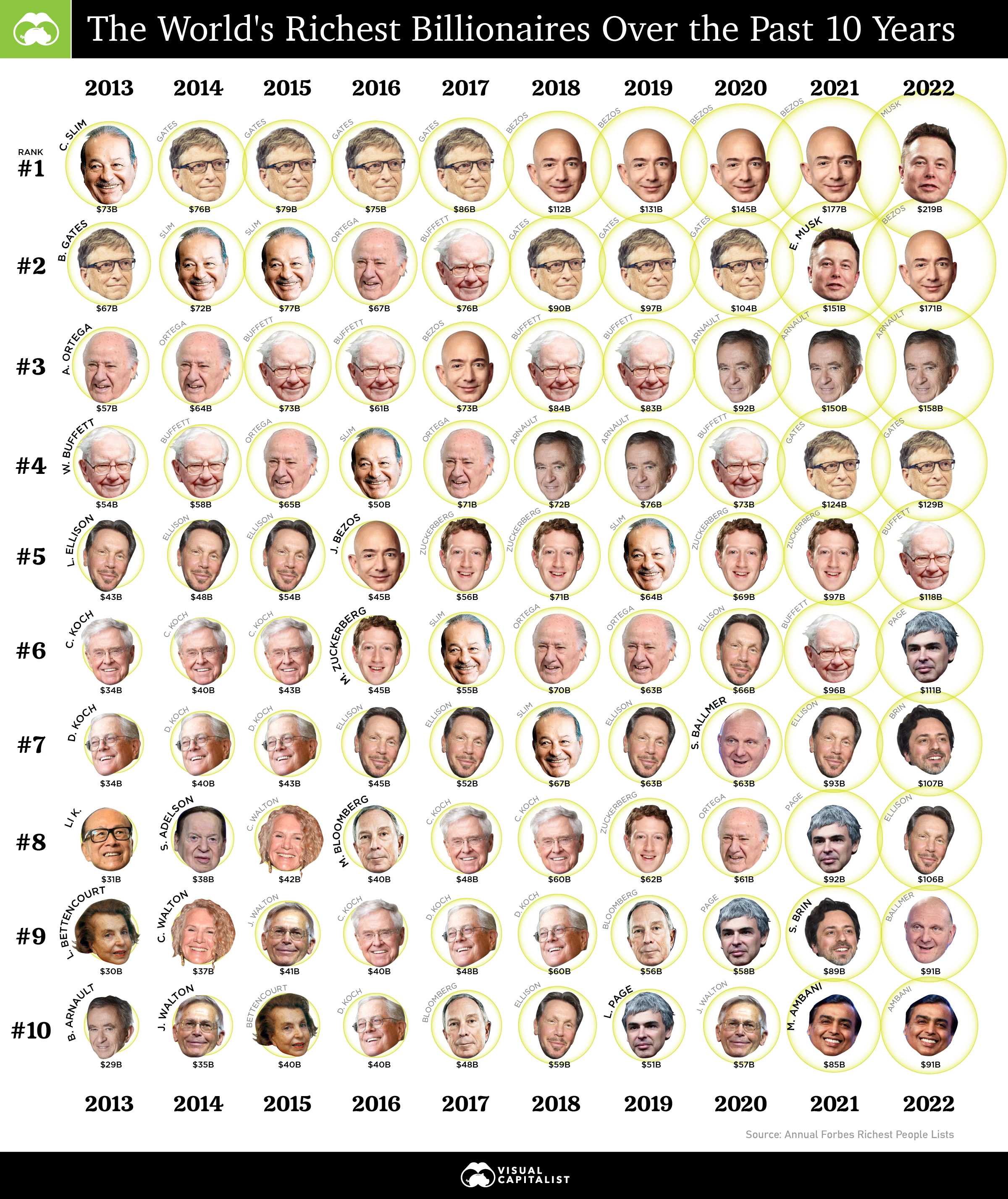 This visualization looks at the ballooning wealth and ranking of the top 10 billionaires over the past 10 years.