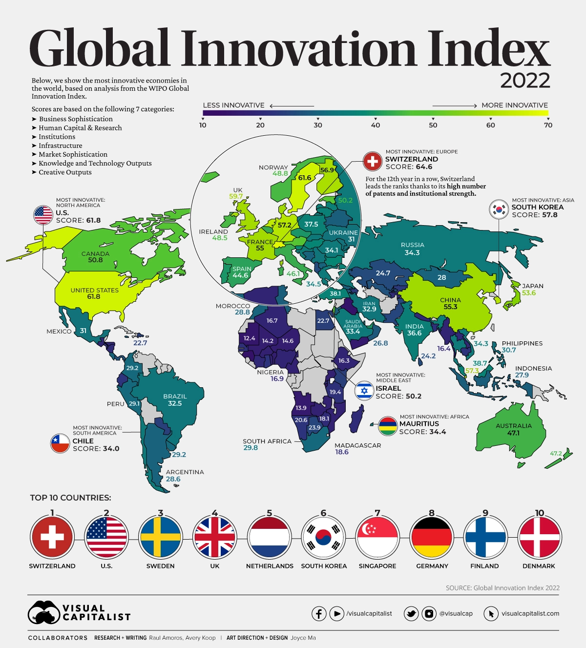 μ΄ μΈν¬κ·Έλν½μ VISUAL CAPITALISTκ° WIPO κΈλ‘λ² νμ μ§μλ₯Ό λ°νμΌλ‘ μ 리ν κ²μΌλ‘ λλΌλ³ νμ μ§μμ κ°μ₯ λμ μ μλ₯Ό λ°μ μμ 10κ° κ΅κ°λ₯Ό μκ°νκ³ μλλ°μ. κΈλ‘λ² νμ μ§μλ κ²½μ κ·λͺ¨μ μΈνλΌ, μΈμ μμκ³Ό μ λΆ, νΉνμΆμ λ± 7κ° λ²μ£Ό 81κ° μ§νλ₯Ό ν΅ν΄ λΈ μ μμ