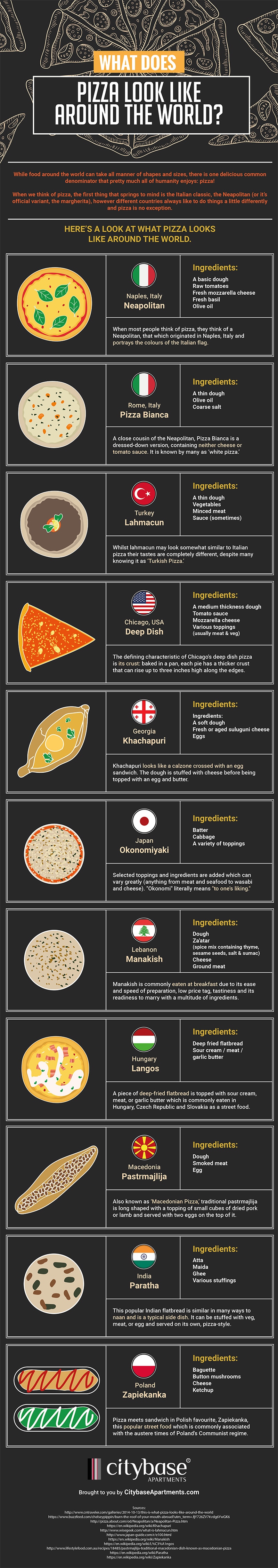 We take a look at what pizza looks like around the world, depicting and listing the ingredients of variations from 11 different places.