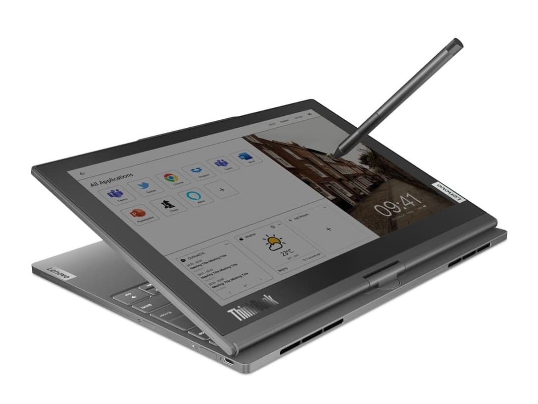 Innovative ThinkBook Plus twistable form factor with a dual rotating display features an OLED panel on one side and a colorful e-Ink screen on the other.