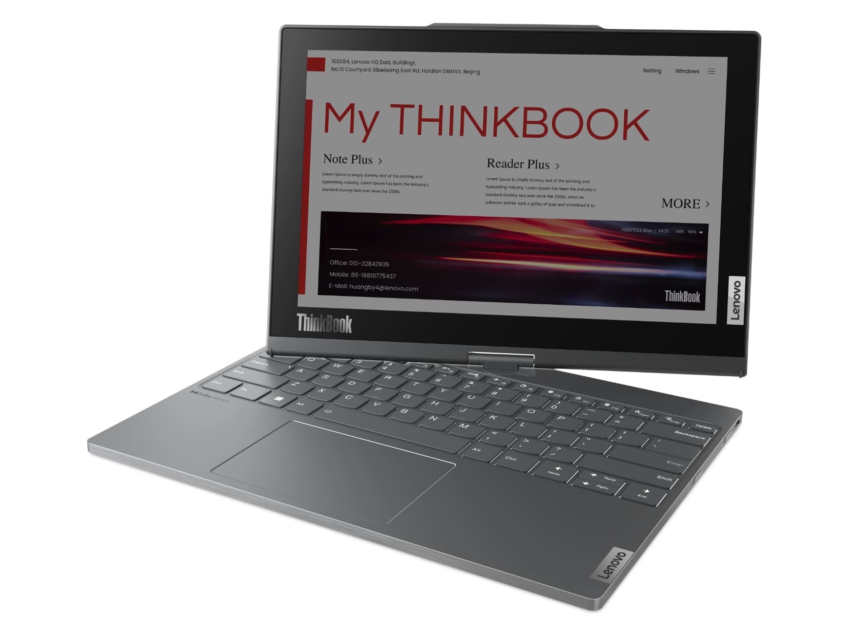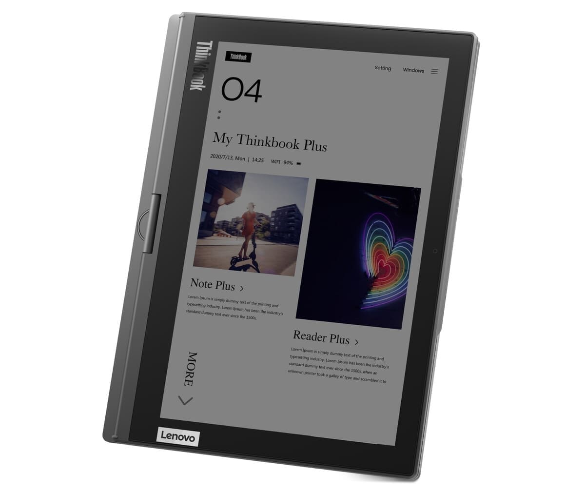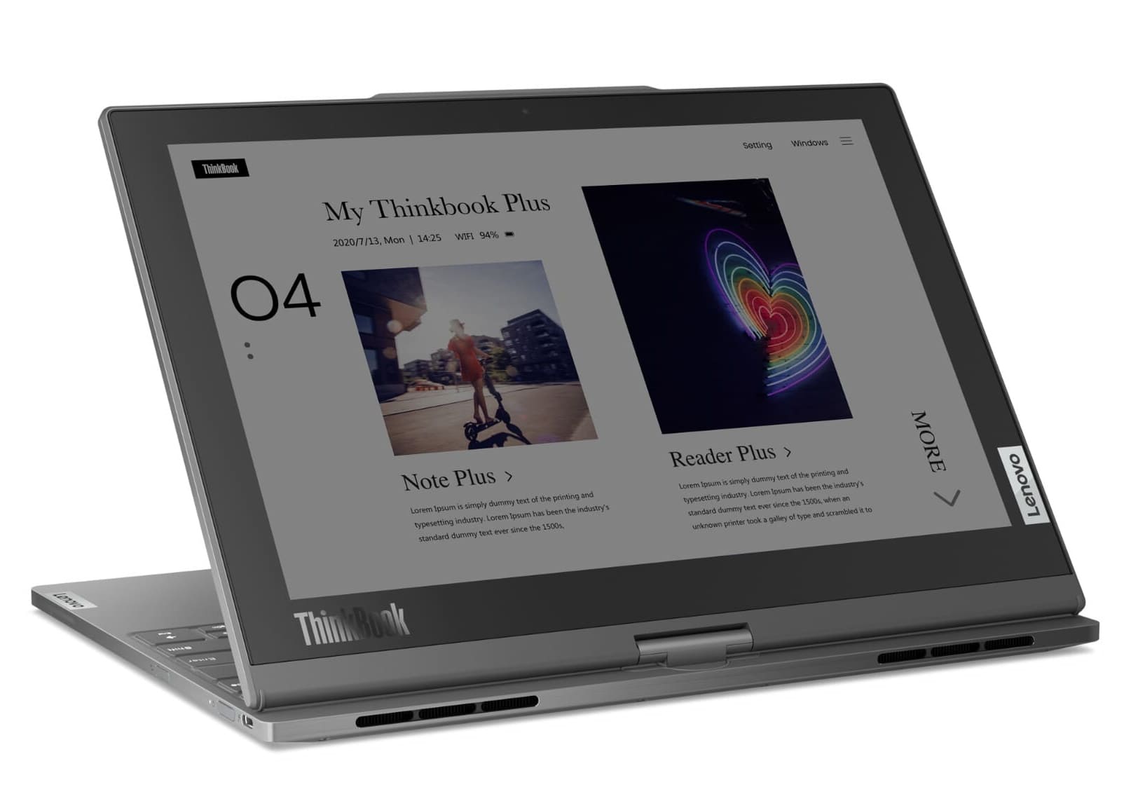 Innovative ThinkBook Plus twistable form factor with a dual rotating display features an OLED panel on one side and a colorful e-Ink screen on the other.