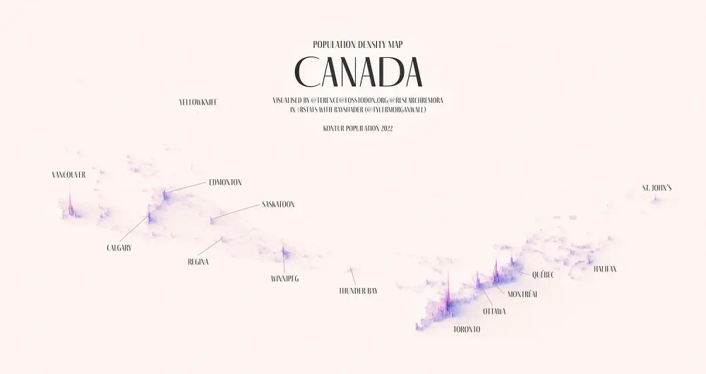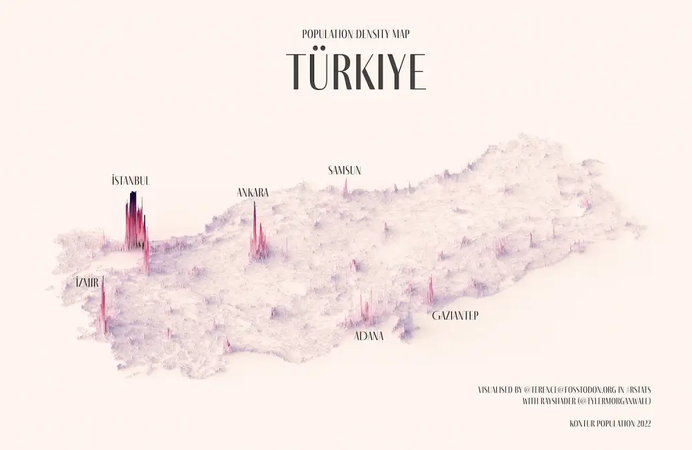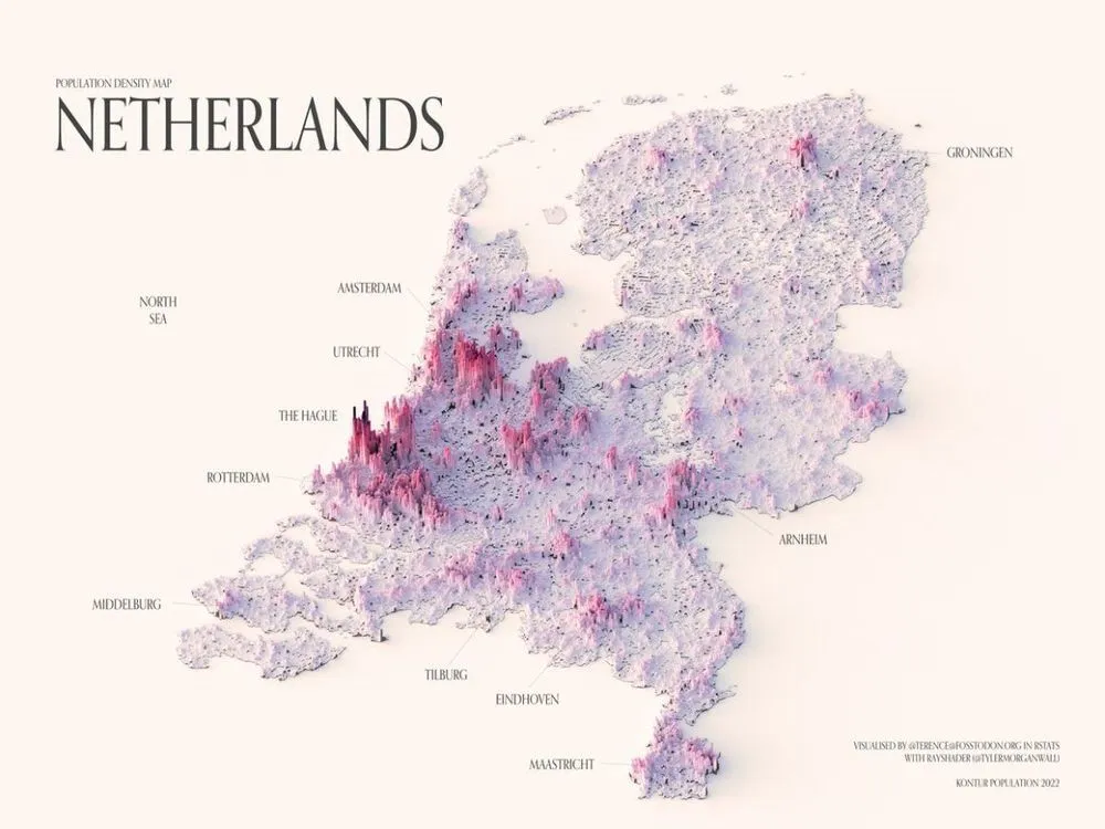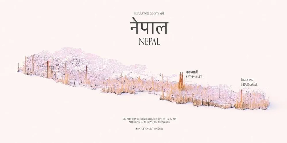These maps show the population density of several countries, using 3D spikes to denote where more people live.