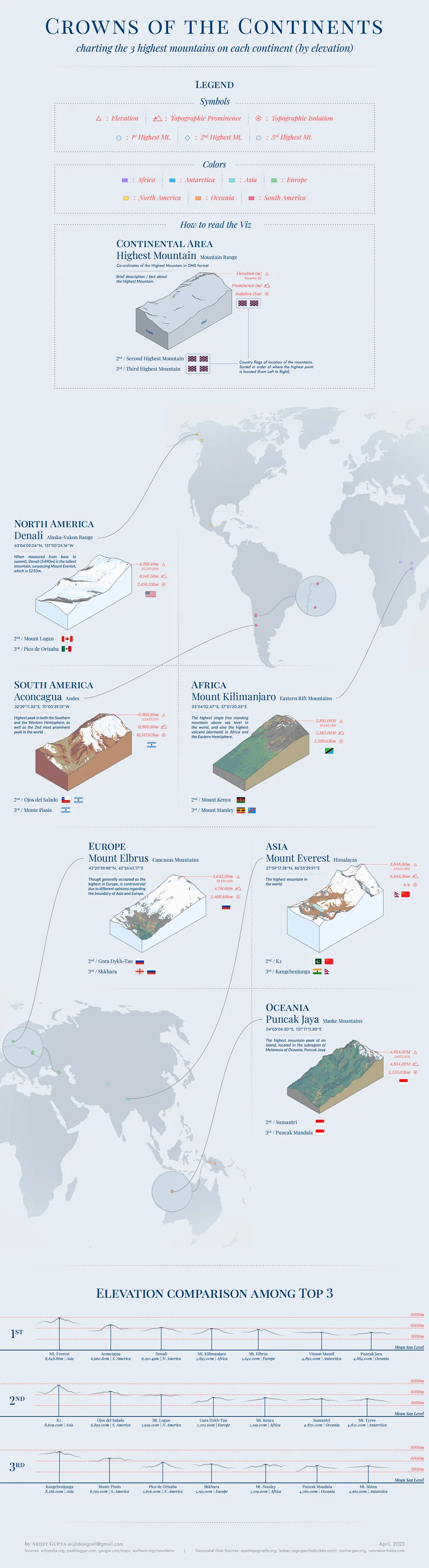 What are the highest mountains in different parts of the world? This visual maps the three tallest mountains by elevation in each continent.