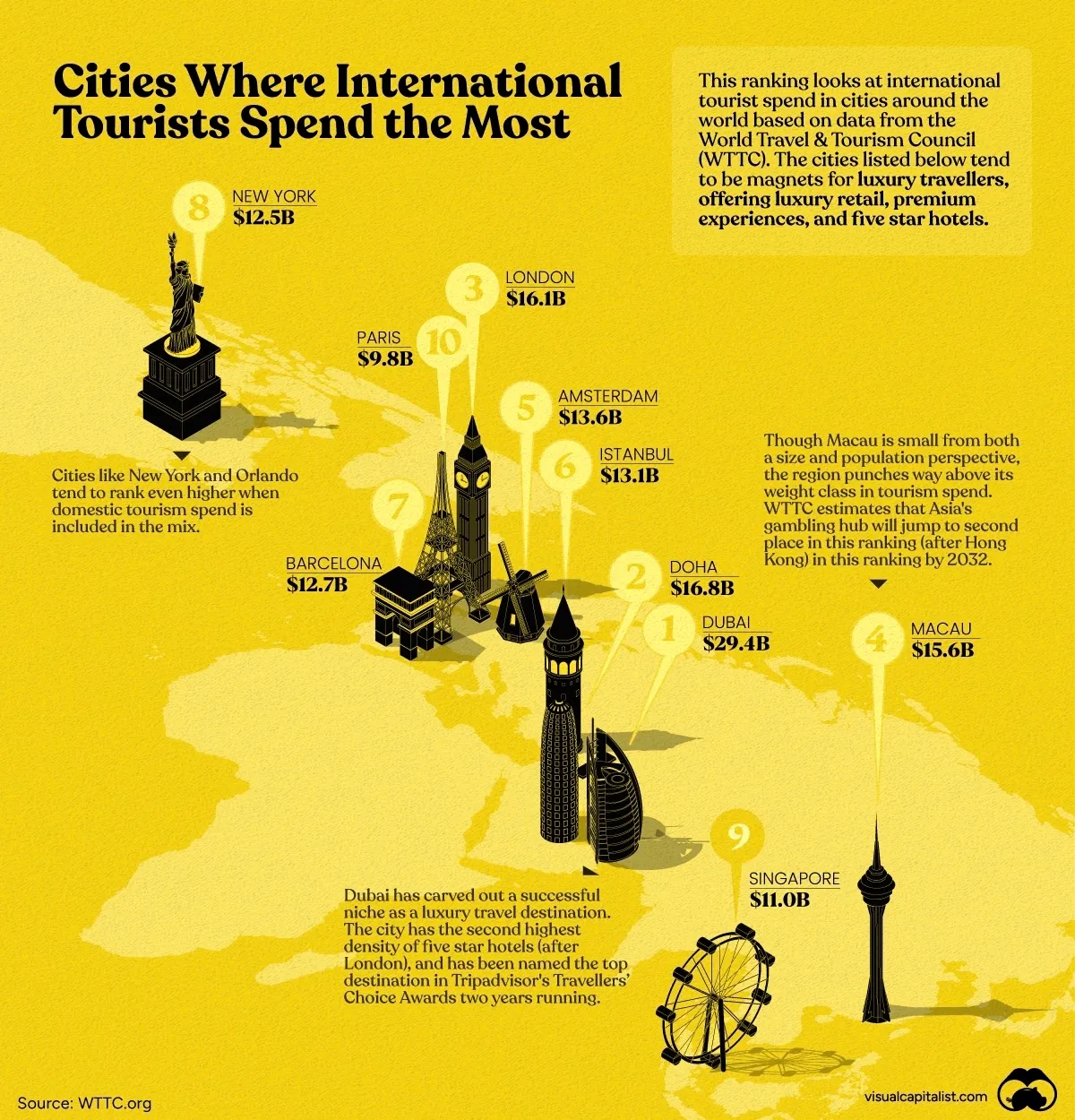 This infographic highlights the 10 cities where international travelers spend the most. In 2022, Dubai took top spot.