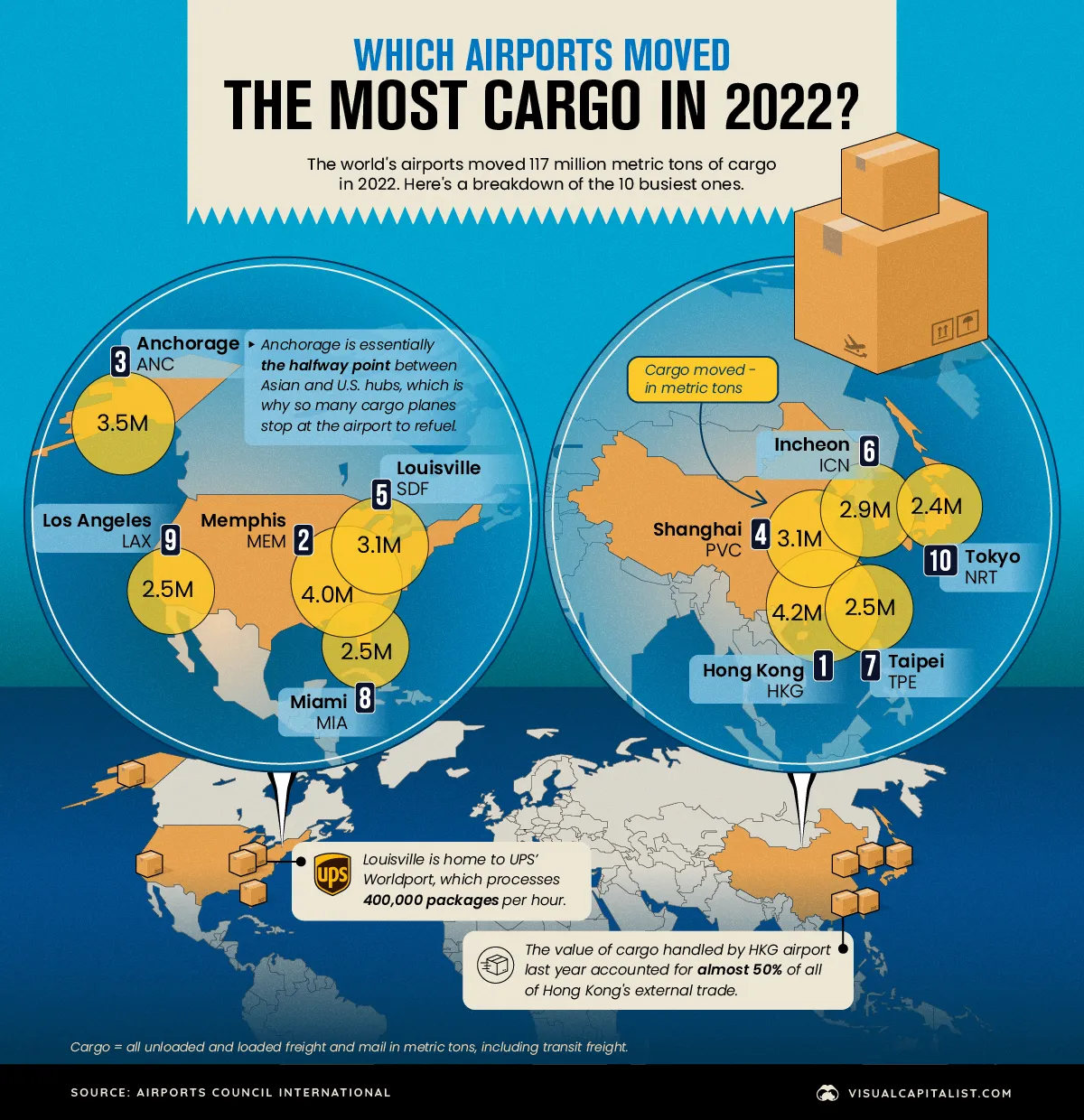 Cargo that moves through airports represents the value of around 35% of world trade. These hubs move the most cargo globally.