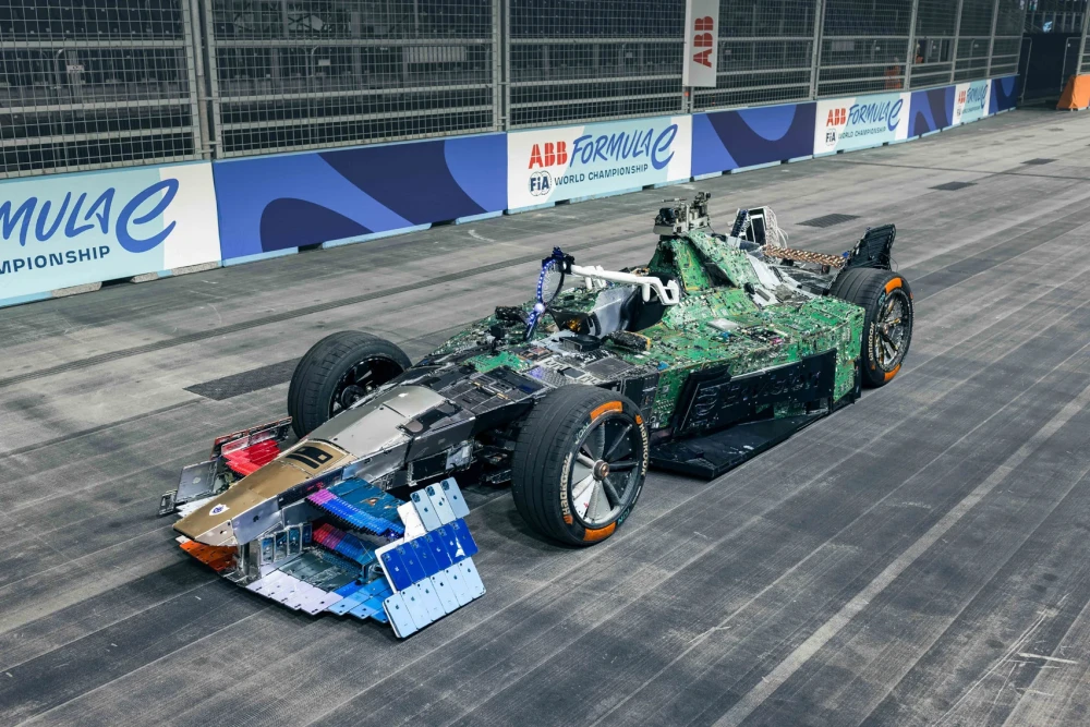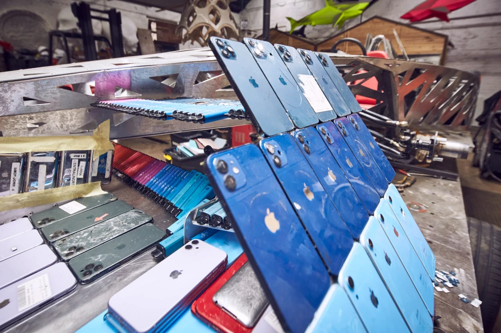 Discarded iPhones, vapes, a fly swatter and a 1950s radio form Recover-E, a replica racing car built entirely out of electronic waste by Manchester design studio Lazerian.