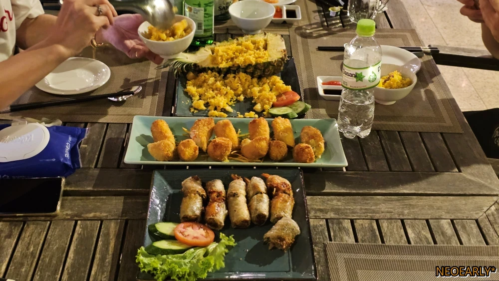 ๋ฒ ํธ๋จ์์์ ๋ง์ง๋ง ์์ฌ๋ ๋ฐ๋ฌด์ ํฌ์์ฆ์ค ํ๋(Bแปn Mùa - Fourseasons Phan Rang)์์ ํด์ฐ๋ฌผ ์์ฃผ์ ์๋ฆฌ๋ก ๋ง๋ฌด๋ฆฌํ๋๋ฐ์. ์ ์ ํ ํด์ฐ๋ฌผ์ ๊ตฝ๊ณ ํ๊ธฐ๊ณ ํ๊ฑฐ๋ผ์ ๋ถ๋ด์์ด ๋ง์๊ฒ ๋จน์์ต๋๋ค. ๋ง์ง๋ง ๋ง์ฐฌ ๊ฐ์ ์๊ฐ์ด๋ผ ๊ฐ์กฑ๋ค๊ณผ ์ด๋ฐ ์๊ธฐ ์ ๋ฐ ์๊ธฐํ๋ฉด์ ์ฌ๋ฌ ๊ฐ์ง ๋ฉ๋ด๋ฅผ ๋ง๋ดค์ฃ . ์ฌ๊ธฐ๋ ์ฌํ์ฌ์ชฝ๊ณผ ์ ํด๋ ๊ณณ์ธ ๋ฏ ํ์ง๋ง, ๋ง์กฑ์ค๋ฌ์ ๋ค์. ๊ทธ๋ฆฌ๊ณ ๋ณด๋ฉด ์ธ๊ตญ ์ฌํ ์ค์ ์ด๋ ๊ฒ ์๋ฐ์ด ํ์ง ๊ฐ์ด๋ ํฌ์ด ๊ฐ์ ํ๋ก๊ทธ๋จ์ ๋ง์กฑ๋๊ฐ ๊ฝค ๋์๋ค์. ๋ช ํด์ ๋ฐ๋ฅด์