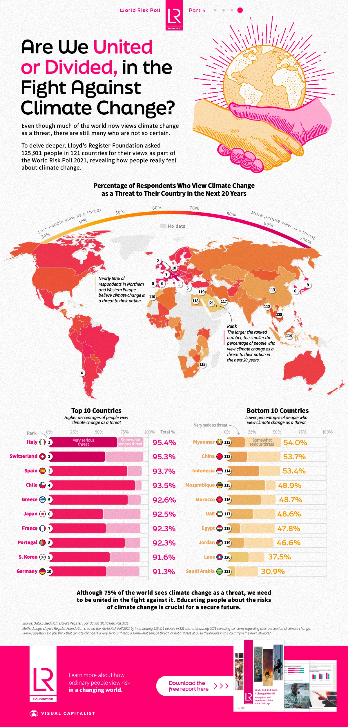 Lloyd's Register Foundationμ μ€λ¬Έμ‘°μ¬ κ²°κ³Όλ₯Ό λ°νμΌλ‘ VISUAL CAPITALISTκ° μκ°νκ³ μλ κΈ°ν λ³νμ λν κ°κ΅ λμ€μ μΈμμΈλ°μ. 121κ°κ΅μμ 125,911λͺ