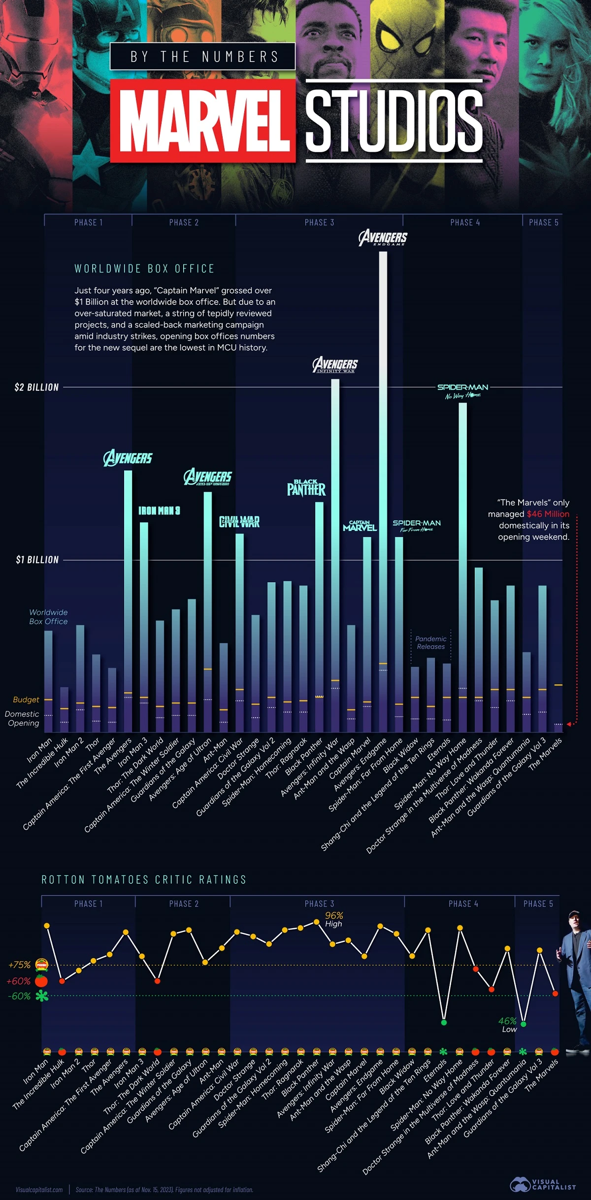 The Numbers์ ์๋ฃ๋ฅผ ๋ฐํ์ผ๋ก VISUAL CAPITALIST๊ฐ ์ ๋ฆฌํ ์ด ์ธํฌ๊ทธ๋ํฝ์ ๋์ฆ๋(Disney)์ ๋ง๋ธ ์คํ๋์ค(MARVEL STUDIOS)๊ฐ ์ด๋๊ณ ์๋ ๋ง๋ธ ์๋ค๋งํฑ ์ ๋๋ฒ์ค(MCU)์ ๊ณผ๊ฑฐ์ ์๊ด๊ณผ ํ์ฌ์ ์ํฉ์ ๊ณ ์ค๋ํ ๋ณด์ฌ์ฃผ๊ณ ์์ต๋๋ค.