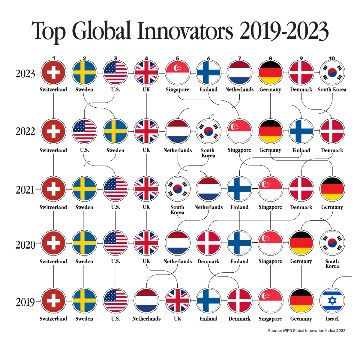 μΈκ³μ§μ μ¬μ°κΆκΈ°κ΅¬(World Intellectual Property Organization)μ 2023 κΈλ‘λ² νμ μ§μλ₯Ό λ°νμΌλ‘ VISUAL CAPITALISTκ° μ 리ν μ΄ μΈν¬κ·Έλν½μ κ·Έλ° μμ€μ μΈκ³μμ κ°μ₯ νμ μ μΈ λλΌκ° μ΄λμΈμ§λ₯Ό μκ°νκ³ μμ΅λλ€. νΉν μΆμκ³Ό μΈμ μλ³Έκ³Ό μ°κ΅¬ νν©, λΉμ¦λμ€λ μμ₯μ μν©, μνμΆμμ΄λ λΈλλμ κ°μΉ, μΈνλΌμ μ λΆμ κ·μ λ μ μ±