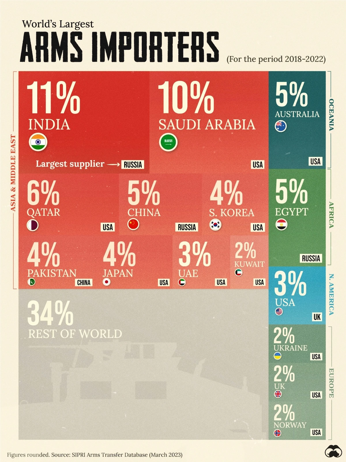 ํฉ๋๋ค. ๋ฌผ๋ก ๊ทธ๋ฐ ์์์ ๋ง์ถฐ ๋ฌด๊ธฐ๋ฅผ ๋ง๋ค์ด์ ์์ถํ๊ธฐ๋ ํ๊ณ ์. VISUAL CAPITALIST๊ฐ ์คํกํ๋ฆ ๊ตญ์ ํํ์ฐ๊ตฌ์(SIPRI/Stockholm International Peace Research Institute)์ ์๋ฃ๋ฅผ ๋ฐํ์ผ๋ก ์ ๋ฆฌํ ์ด ์ธํฌ๊ทธ๋ํฝ๋ค์ 2018๋