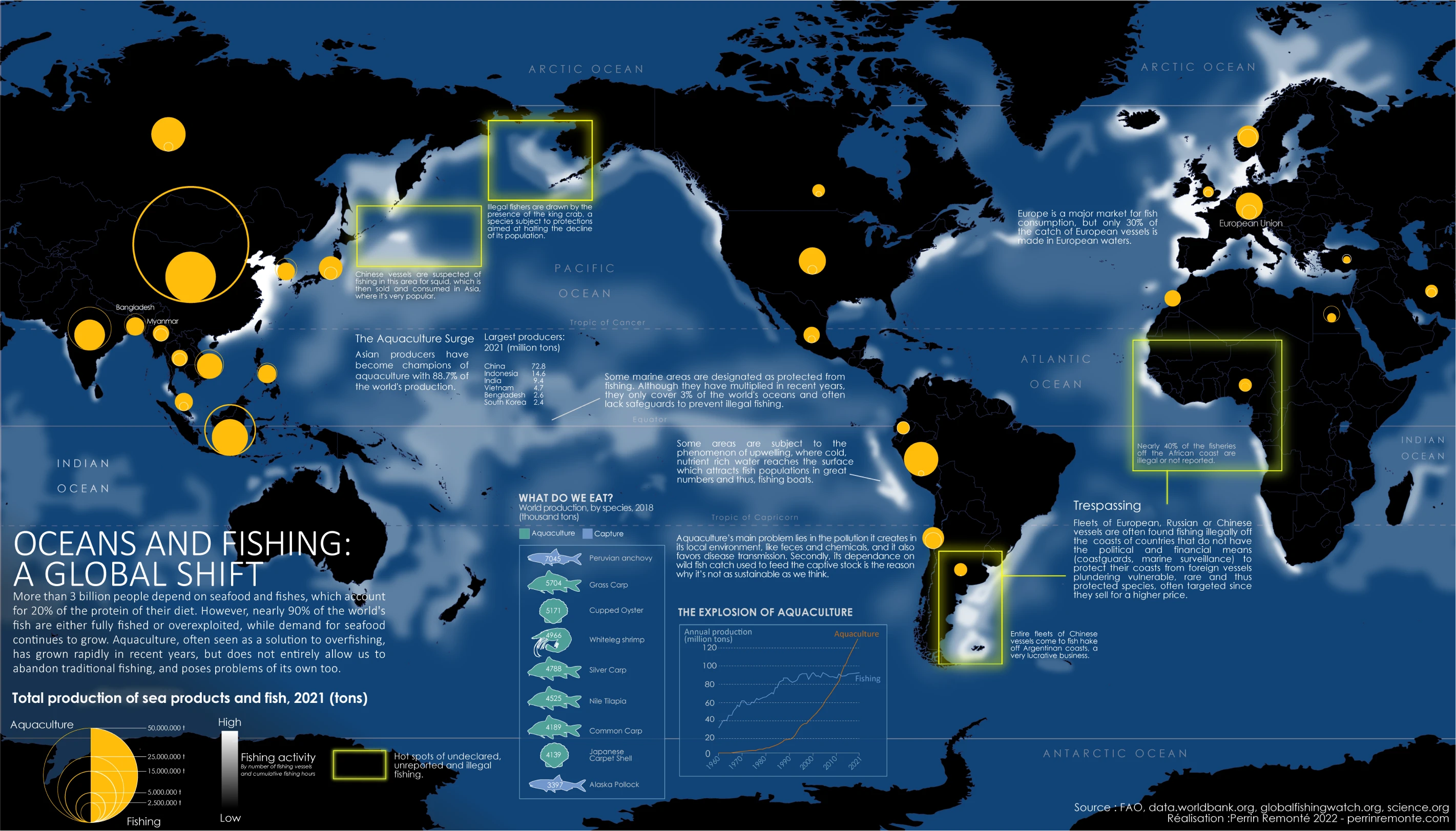 Perrin Remonté๊ฐ ๋ง๋ ์ด ์ธํฌ๊ทธ๋ํฝ์ ๊ทธ๋ ๊ฒ ์์ฐ๋ฌผ์ ์ฌ๋ํ๋ ์ด๋ค์ ์ํด ์ฃผ์ ๊ตญ๊ฐ๋ค์ด ์ผ๋ง๋ ๋ฌผ๊ณ ๊ธฐ๋ฅผ ์ก๊ณ ๋ ๊ธธ๋ฌ๋ด๋์ง ์ฆ, ์์ํ๋์ง๋ฅผ ์ธ๊ณ ์ํ์ ๋ฐ์ดํฐ๋ฅผ ๋ฐํ์ผ๋ก ๋ด๊ณ ์๋๋ฐ์. ๋
