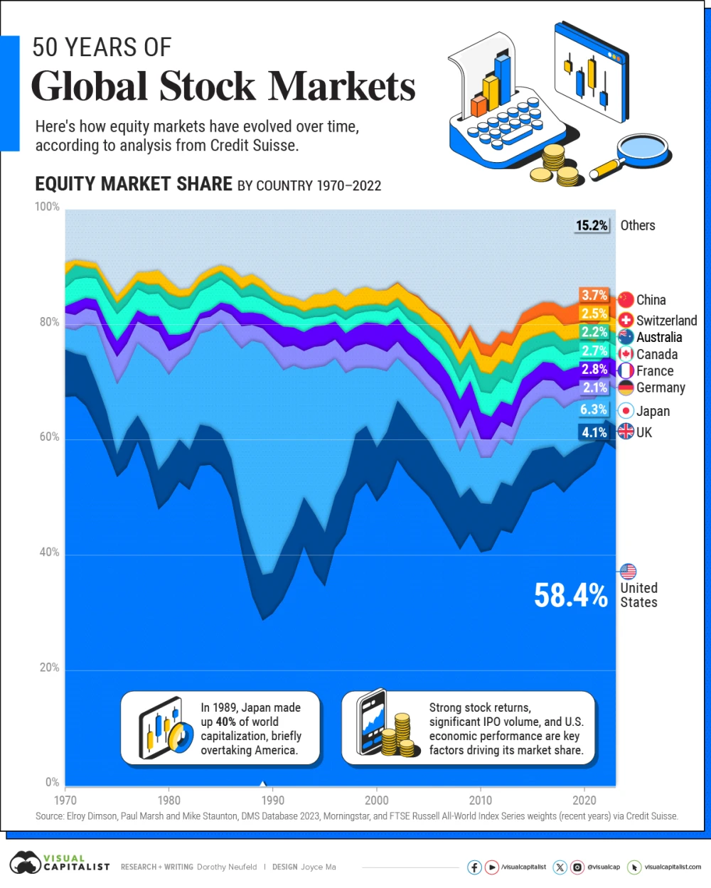 ๊ฐ ๊ธ๋ก๋ฒ ์ฃผ์ ์์ฅ์ ๊ท๋ชจ๋ ์ด๋ ์๊น์? VISUAL CAPITALIST๊ฐ Credit Suisse์ ์๋ฃ๋ฅผ ๋ฐํ์ผ๋ก 1970๋