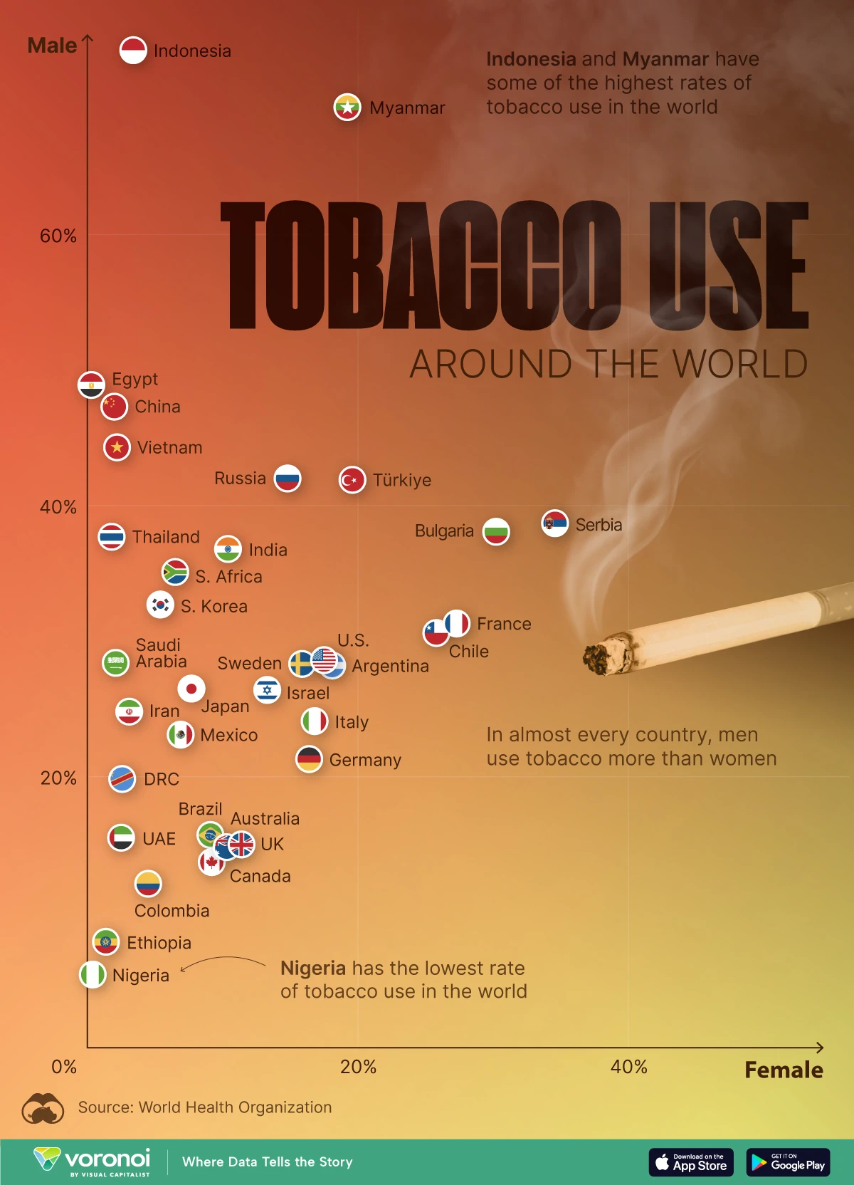 What We’re Showing The prevalence of tobacco use in selected countries around the world using the latest data from the World Health Organization.