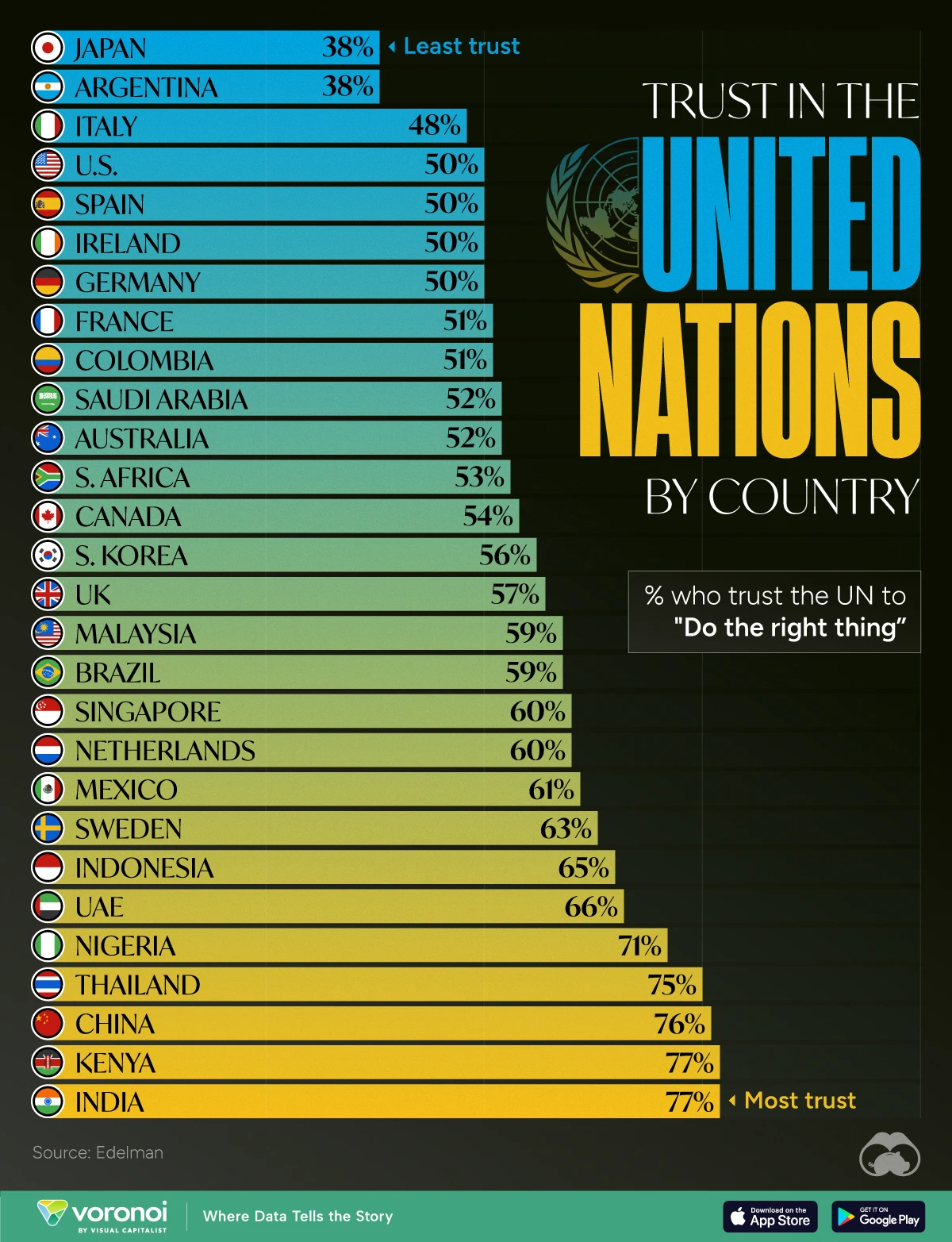What We're Showing The level of trust the public in 28 countries have in the United Nations using Edelman's 2024 Trust Barometer Global Report.