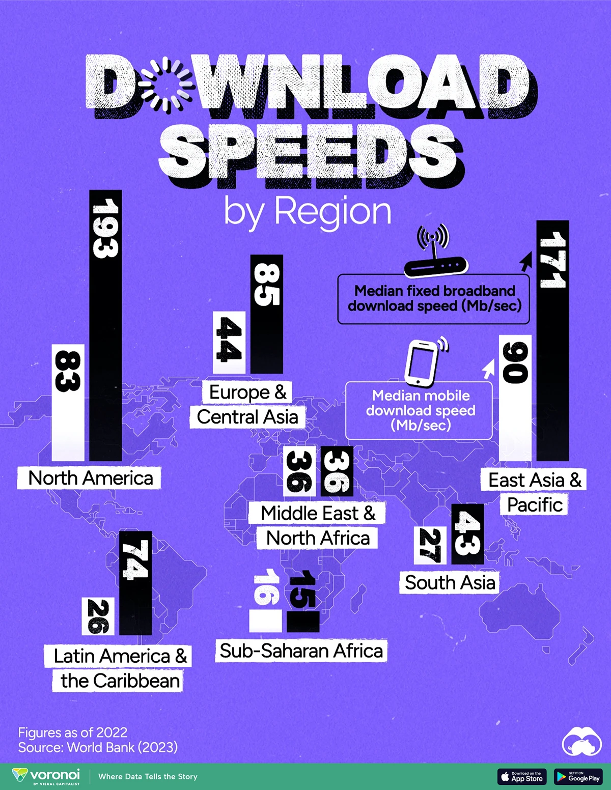 What we’re showing Median download speeds in each global region, based on data from the World Bank’s Digital Progress and Trends Report 2023.