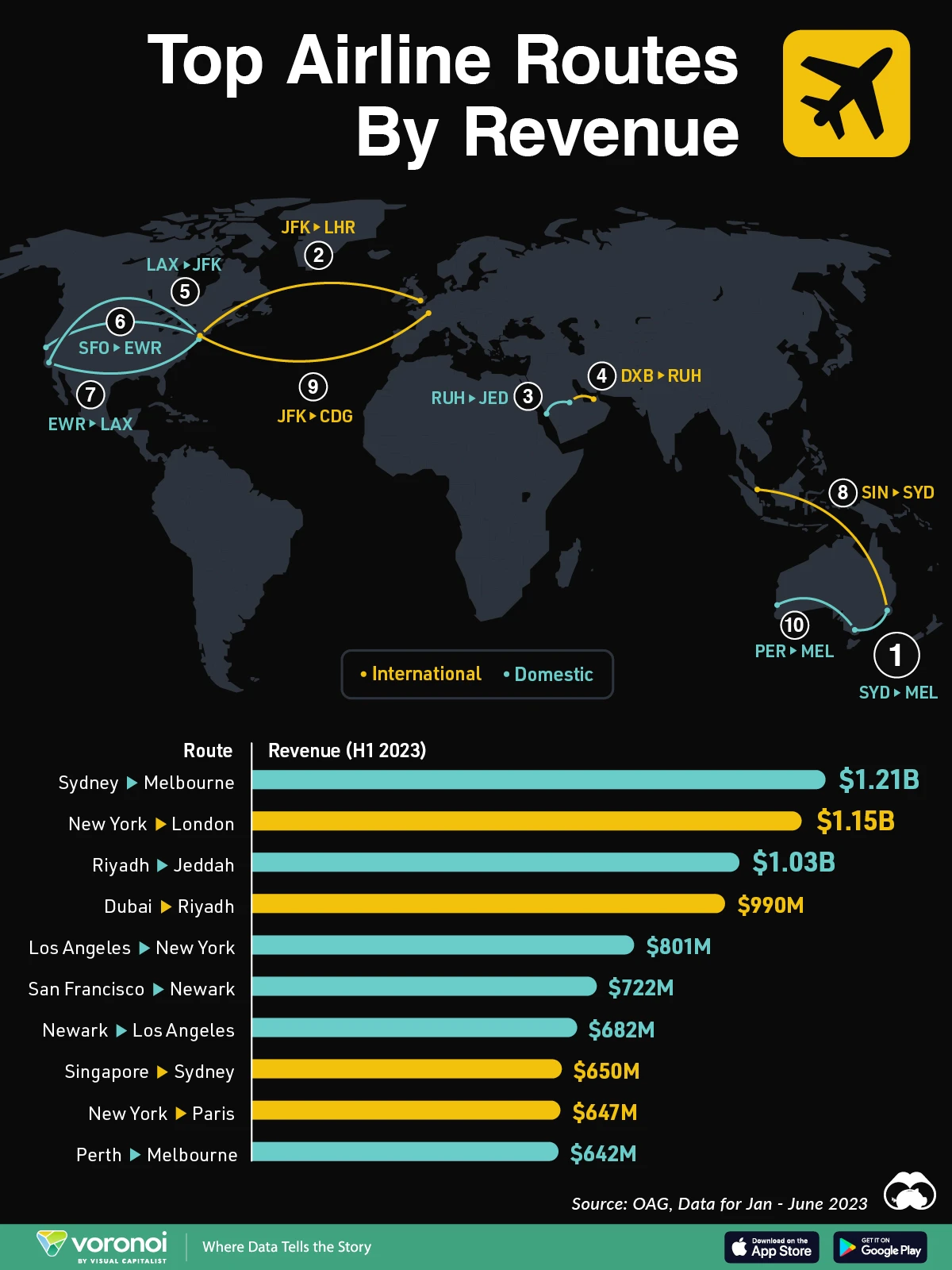 What We’re Showing The 10 airline routes with the highest revenues for the first half of 2023, based on data from OAG.