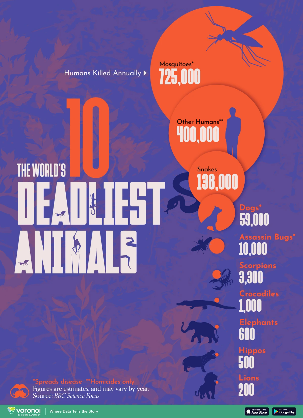 What We’re Showing A chart ranking the top 10 deadliest animals by the number of people killed per year.