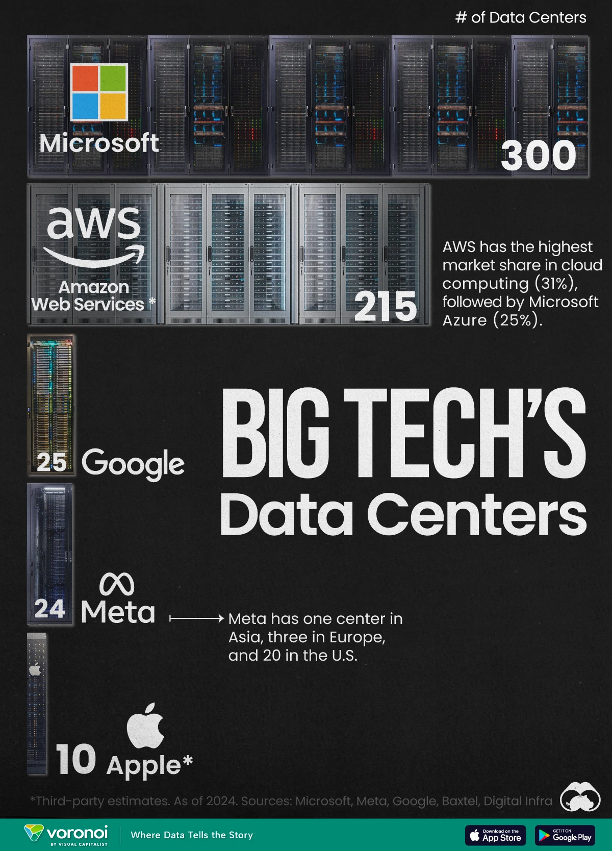 What We’re Showing A chart showing major tech companies and the number of their data centers. Third-party estimates have been used for Apple and AWS.