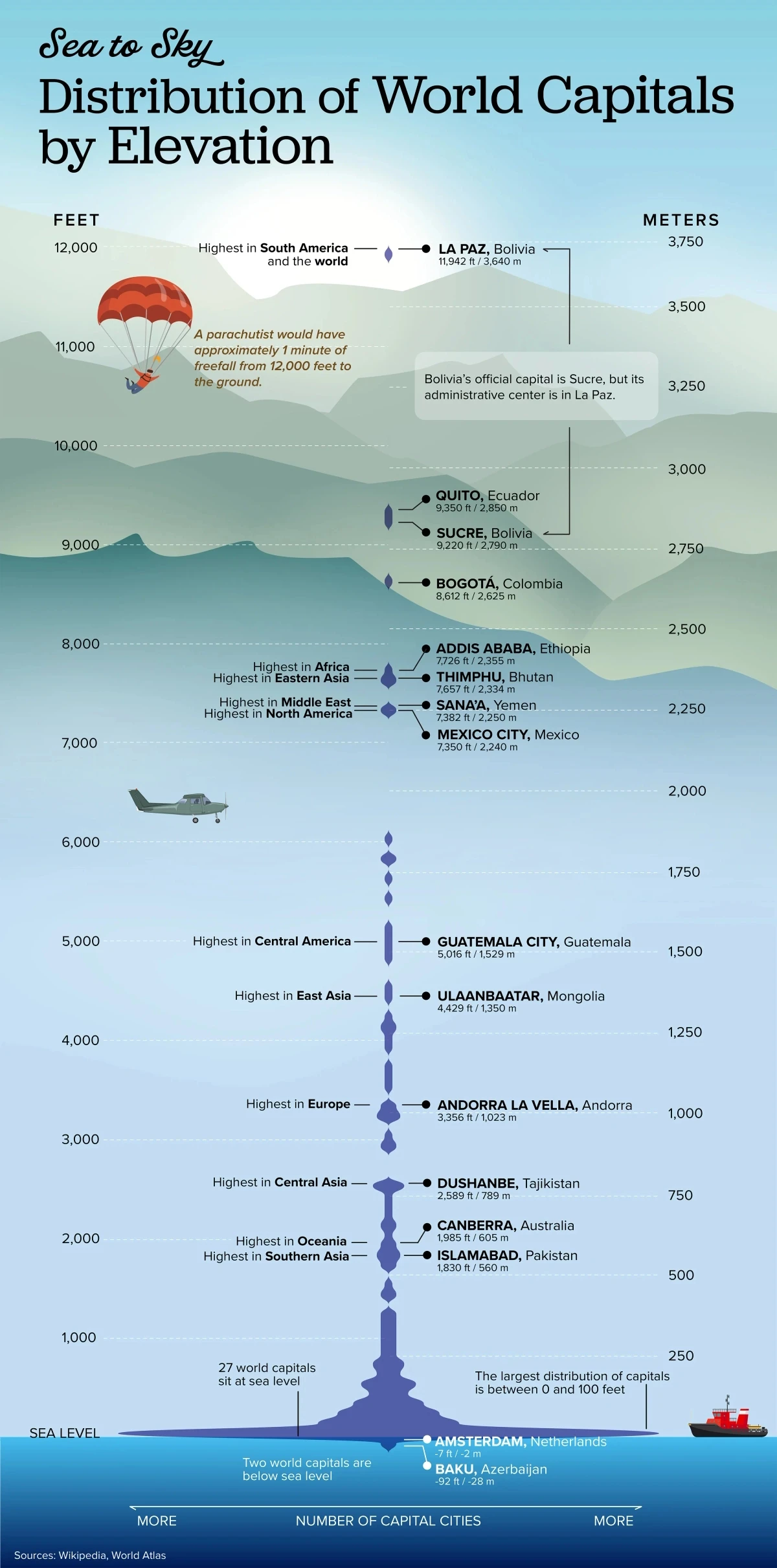 If you plot the elevations of the world's 197 capital cities*, the distribution forms the central shape in this chart, with most cities at lower elevations and a few sparsely distributed through higher elevations. The highest capital is La Paz, Bolivia at