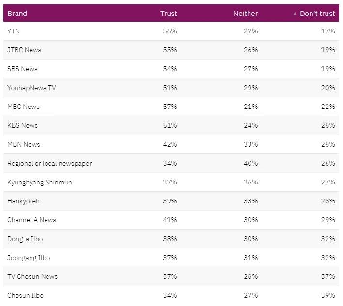 South Koreans' trust in the news remains generally low, with 31% of respondents trusting the news in 2024, a slight increase from the previous year. Among the brands we cover, Koreans tend to trust broadcast media such as MBC, YTN, JTBC, SBS, and KBS, whil