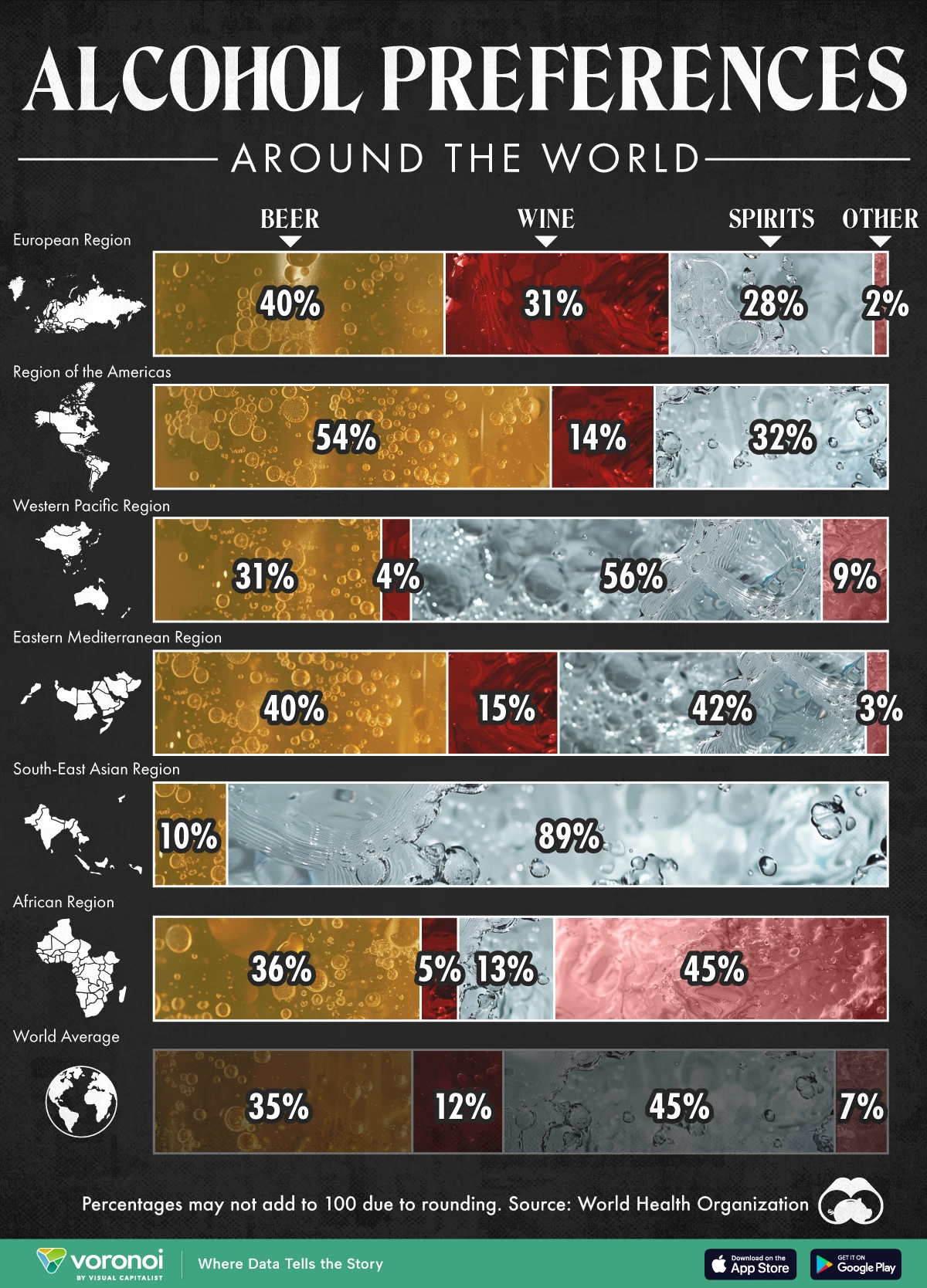 What We’re Showing The percentage of alcohol consumption by beverage type around the world in 2019, based on data from the World Health Organization.