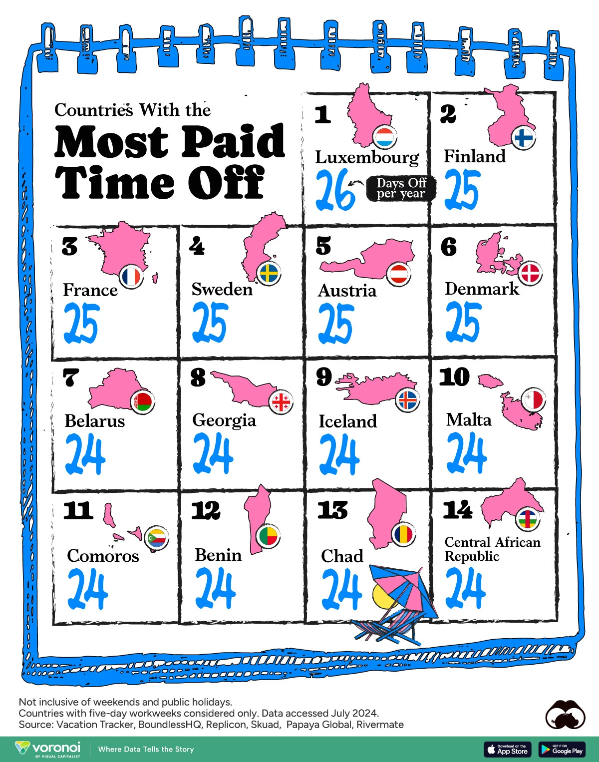 What We’re Showing This graphic ranks the countries with the highest number of mandatory paid days off in a year.
