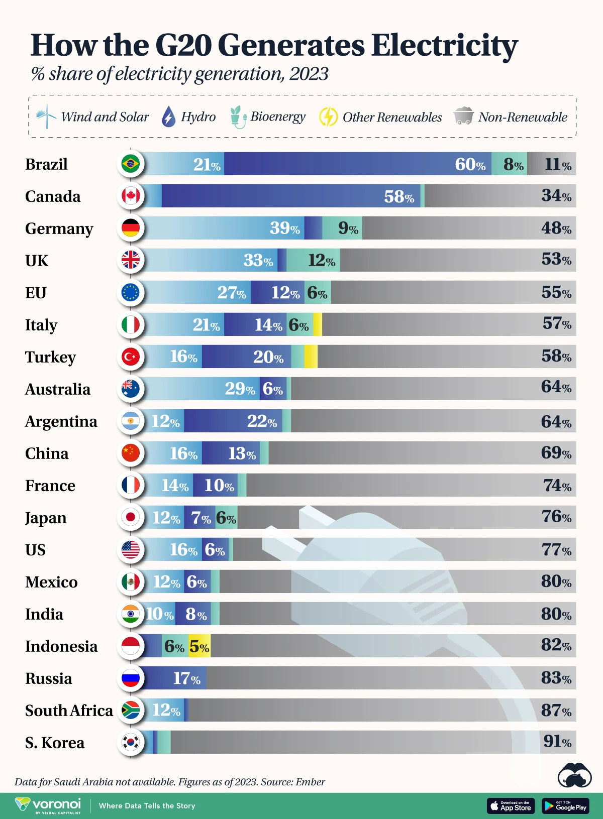 What We’re Showing This graphic shows how much electricity is generated from renewable sources among G20 countries.