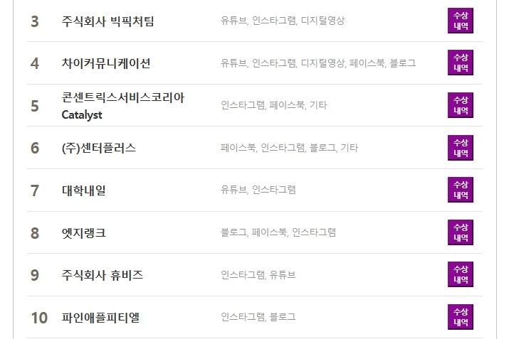 2์์ ์ค๋ฅธ ์๋์ค ์ ๋(WITHUS AD)๋ ๋ฒ ์ด๋ฒ ํฐ ์บ ํ์ธ ์์์ ํตํด ์ฌํ์ ๊ธฐ์ ๋ถ์ผ ๋์งํธ์์ ๋์๊ณผ ์ธ๋ผ์ ฌ ์ธ์คํ๊ทธ๋จ์ ํตํด ์๋ฃ๊ธฐ๊ธฐ๋ถ์ผ ์ธ์คํ๊ทธ๋จ ๋์, ๊ฒฝ๋์ ์ฝ ์ธ์คํ๊ทธ๋จ์ ํตํด ์๋ฃ๋ถ์ผ ์ธ์คํ๊ทธ๋จ ๋์ ๋ฑ 10๊ฐ์ ์์ ์์ํ๊ณ 3์์ธ ์ฃผ์ํ์ฌ ๋น ํฝ์ฒํ(BIG PICTURE TEAM)์ ์์ธ์๋ฆฌ์๋ณธ๋ถ ์ ํ๋ธ ์ฑ๋์ ํตํด ๊ณต๊ณต๊ธฐ๊ด๋ถ์ผ ์ ํ๋ธ ๋์, DGB ๊ธ์ต๊ทธ๋ฃน ์ธ์คํ๊ทธ๋จ์ ํตํด ๊ธ์ต์ฐ๊ณ์๋น์ค๋ถ์ผ ์ธ์คํ๊ทธ๋จ ๋์ ๋ฑ 8๊ฐ์ ์์ ์์ํ๊ณ ์.