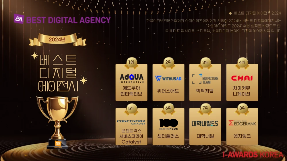 ๊ตญ๋ด๋ฅผ ๋ํํ๋ ์น์ฌ์ดํธ, ์ค๋งํธ์ฑ, ์์ ๋ฏธ๋์ด ๋ถ์ผ ๋์งํธ์์ด์ ์๋ค ์ค์์ 2023 ์์ด์ด์์ฆ ์์์ ์์์ค์ ์ ๋ฐํ์ผ๋ก ํ๊ตญ์ธํฐ๋ท์ ๋ฌธ๊ฐํํ์ ์์ด์ด์์ฆ์์ํ๊ฐ ์ ์ ํ ๋ฒ ์คํธ ๋