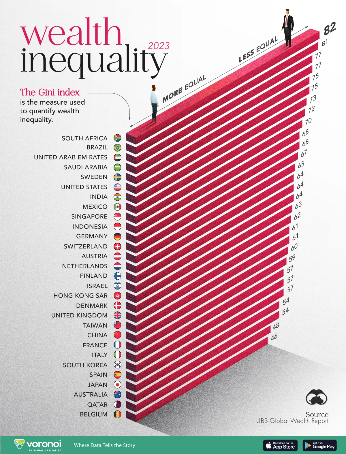 What We're Showing The wealth inequality of a selected number of countries as measured by the Gini index. Figures come from the UBS Global Wealth Report 2024.