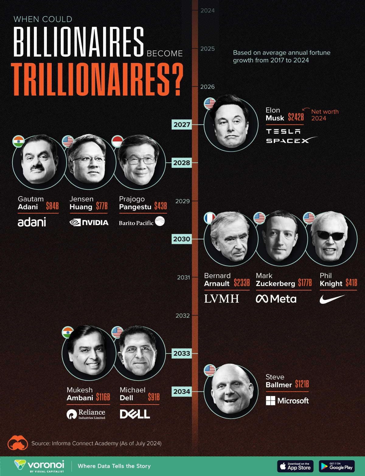 What We’re Showing? This graphic shows when the world’s richest billionaires could become trillionaires, based on data compiled by Informa as of July 2024.…