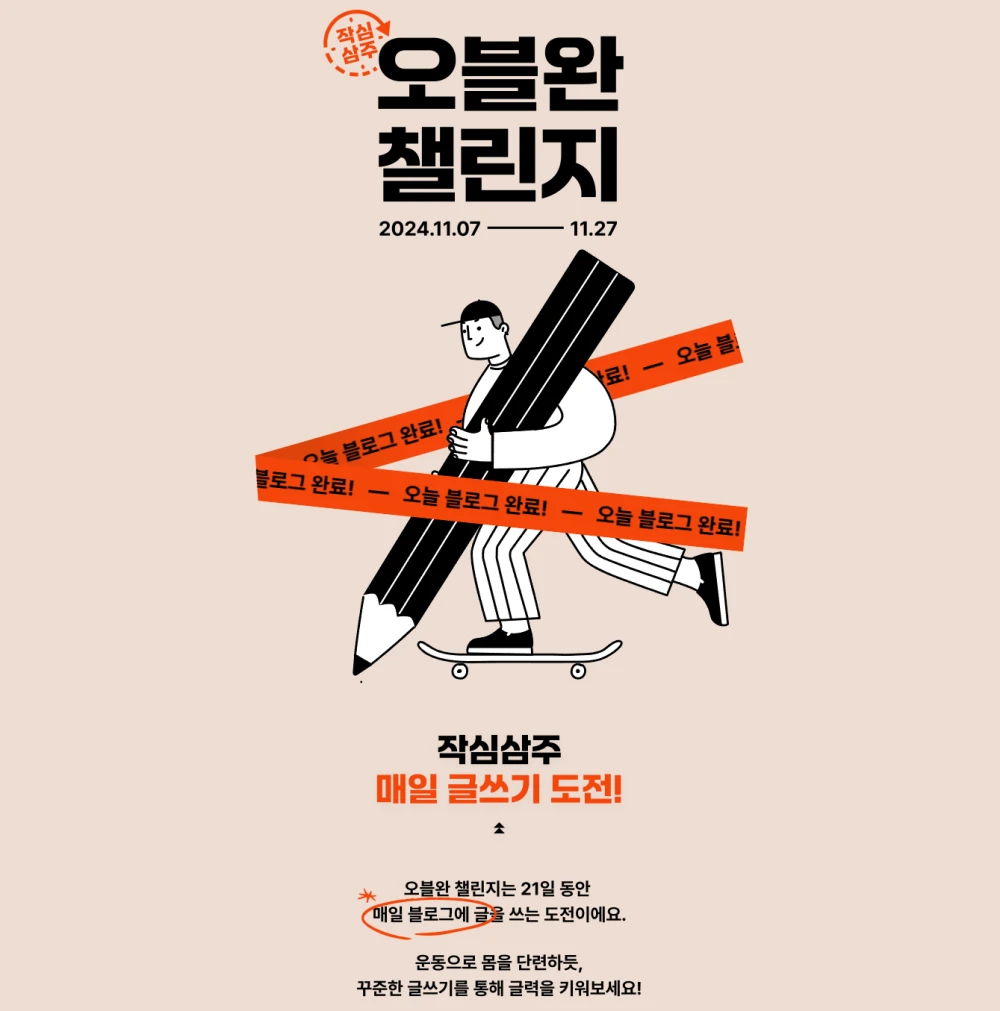 ์ค๋ ๋ธ๋ก๊ทธ ์๋ฃ! 21์ผ ๋์ ๋งค์ผ ๋ธ๋ก๊ทธ์ ๊ธ ์ฐ๊ณ ๊ธ๋ ฅ์ ํค์๋ณด์ธ์.