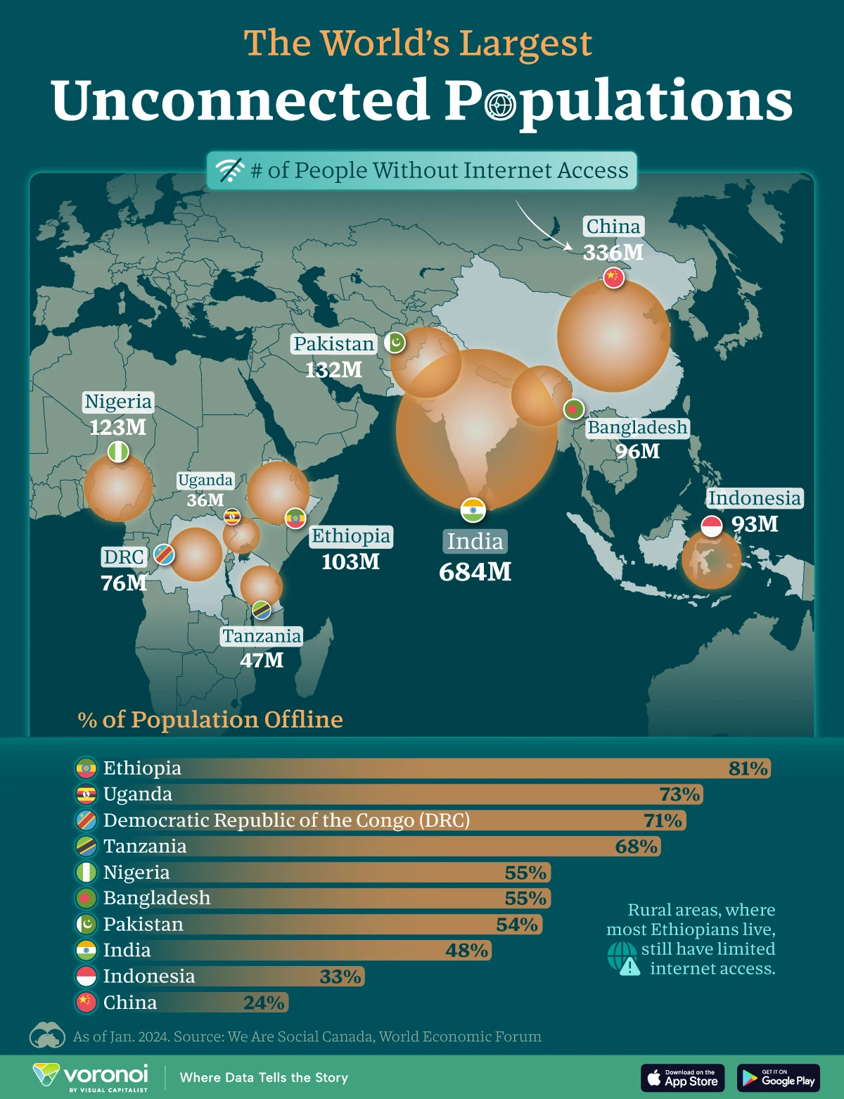 What We’re Showing Countries with the largest unconnected populations in absolute terms, according to We Are Social as of January 2024. Key Takeaways Indi…