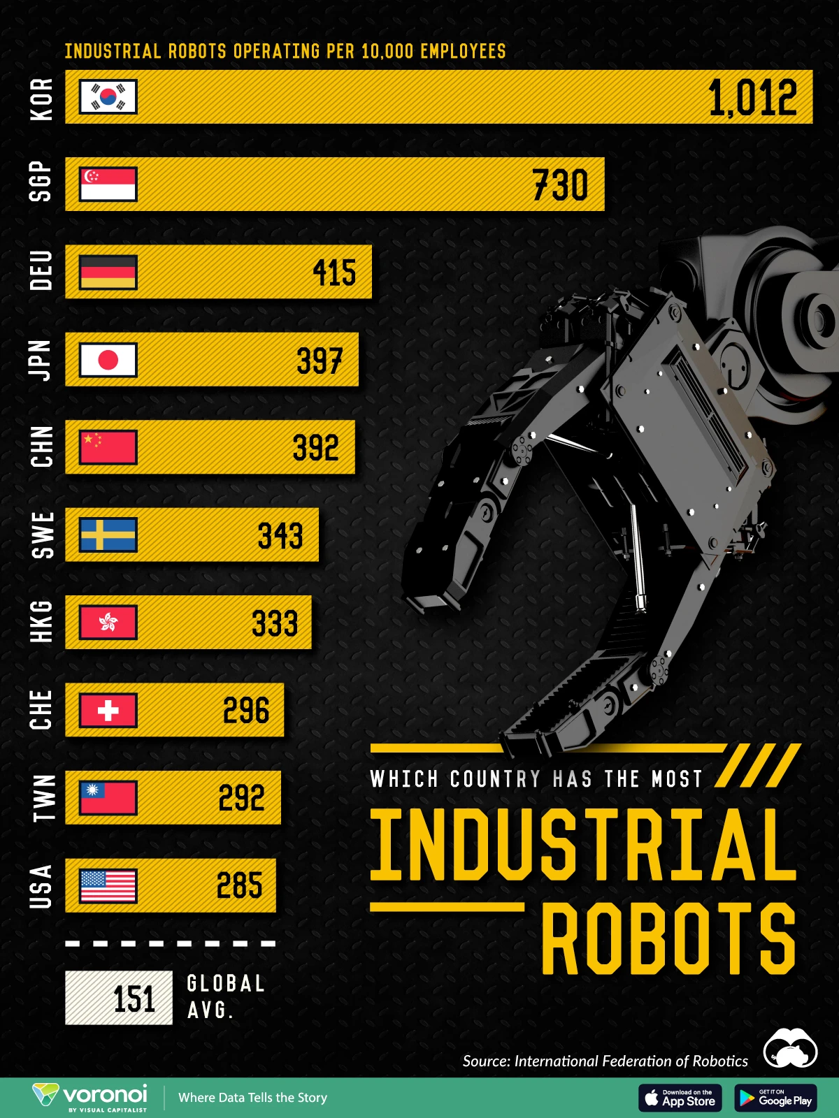 What We’re Showing The number of industrial robots operating per 10,000 employees by country in 2022, the latest data from the International Federation of Ro…