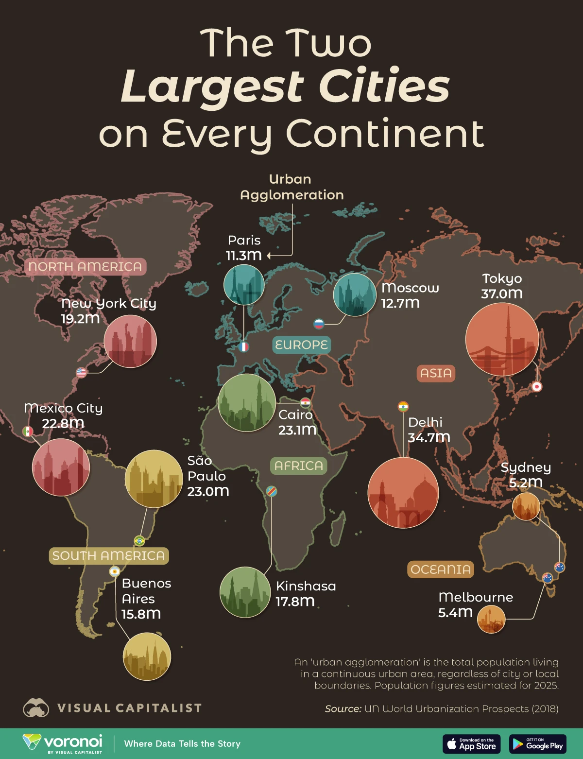 What We’re Showing: This graphic visualizes the two largest cities on every continent, by 2025 estimates for their population. Data is sourced from UN World…