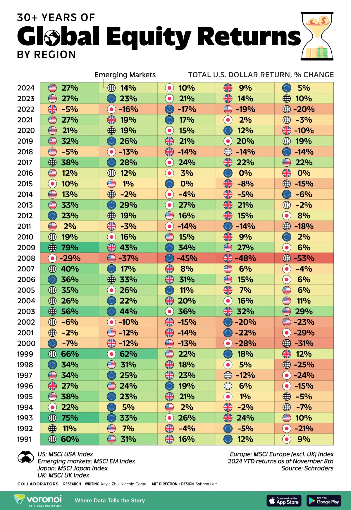 voronoiκ° Schrodersκ° λ―Έκ΅(MSCI USA Index), μ λ½(MSCI Europe Index), μΌλ³Έ(MSCI Japan Index), μκ΅(MSCI UK Index), μ ν₯ μμ₯(Emerging Markets/MSCI EM Index) λ±μ MSCI μ§μλ₯Ό κΈ°μ€μΌλ‘ μ 리ν λ°μ΄ν°λ₯Ό λ°νμΌλ‘ μ 리ν μ΄ μΈν¬κ·Έλν½μλ 1991λ