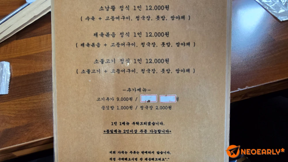 ์ ์ฃผ ๋์ฌ์์ ์ด์ง ๋ฒ์ด๋ ๊ณณ์ ์๋ ์๋ญ๋ฐ์ 1์ธต์ ์๋น, 2์ธต์ ์ฃผ๊ฑฐ์ง๊ฐ ์๋ ๋ฏํ ์ด๋์ง ์ถ์ต ์ด๋ฆฐ(?) ๋๋์ ์๋น์ธ๋ฐ์. ์ฃผ๋ณ์ด ๋ฒํํ์ง ์๊ณ ์ง๋๊ฐ ๋์์ ์์ฌ๋ฅผ ํ๋ฉด์ ๋ฉ๋ฆฌ ์ ์ฃผ ๋ฐ๋ค๋ฅผ ๋ด๋ ค๋ค๋ณผ ์ ์๋ ๊ธฐ๋ ์ด์์ผ๋ก ๋ทฐ๋ ์ข์ ์๋น์ด์์ต๋๋ค. ์ ์ฌ์ด๋ผ ์ด๋ฏธ ์๋น ์์ ๊ฑฐ์ ๋ง์์ด๋๊ตฐ์. ์๋ฆฌ๋ฅผ ์ก๊ณ ๊ฐ๋จํ ๋ฉ๋ดํ์ ํ์ธํด ๋ด ๋๋ค. ๊ฐ๊ฒฉ์ด 12,000์์ผ๋ก ๋์ผํ ์ ์์ ํ๋๋ฐ ๊ณ ๋ฑ์ด๊ตฌ์ด, ์ฒญ๊ตญ์ฅ, ํณ๋ฐฅ, ์์ผ์ฑ๋ฅผ ๊ธฐ๋ณธ์ผ๋ก ์์ก์ด ๋ค์ด๊ฐ๋ ์๋ญ๋ฐ ์ ์, ์ ์ก๋ณถ์์ด ๋ค์ด๊ฐ๋ ์ ์ก๋ณถ์ ์ ์, ์๋ถ๊ณ ๊ธฐ๊ฐ ๋ค์ด๊ฐ๋ ์๋ถ๊ณ ๊ธฐ ์ ์ ๋ฑ์ด ์์๊ณ ๋์ผ ๋ฉ๋ด 2์ธ ์ด์ ์ฃผ๋ฌธ ๊ฐ๋ฅํ๋ค๊ณ ๋์ด ์๊ธด ํ์ง๋ง, ํผ๋ฐฅ์ ๋์๋ ๋ถ๋ ๊ณ์ จ๋ ๊ฑธ ๋ณด๋ฉด 1์ธ 1 ๋ฉ๋ด๋ง ์ฃผ๋ฌธํ๋ฉด ๋๋ ๋ฏํ์ต๋๋ค. ์๋ฐ ์๋น์์ ์ ์ ํ์ง ์๋ ๊ฑด ํ์น ์์ง๋ง, ์ ์ ์ฌ ์ค๋ฉด ์์ ์ ๊ณตํด ์ค๋ค๋ ์ผ์ค๋ ํ์น ์์ ๋ณด์๋ค์.ใ ใ