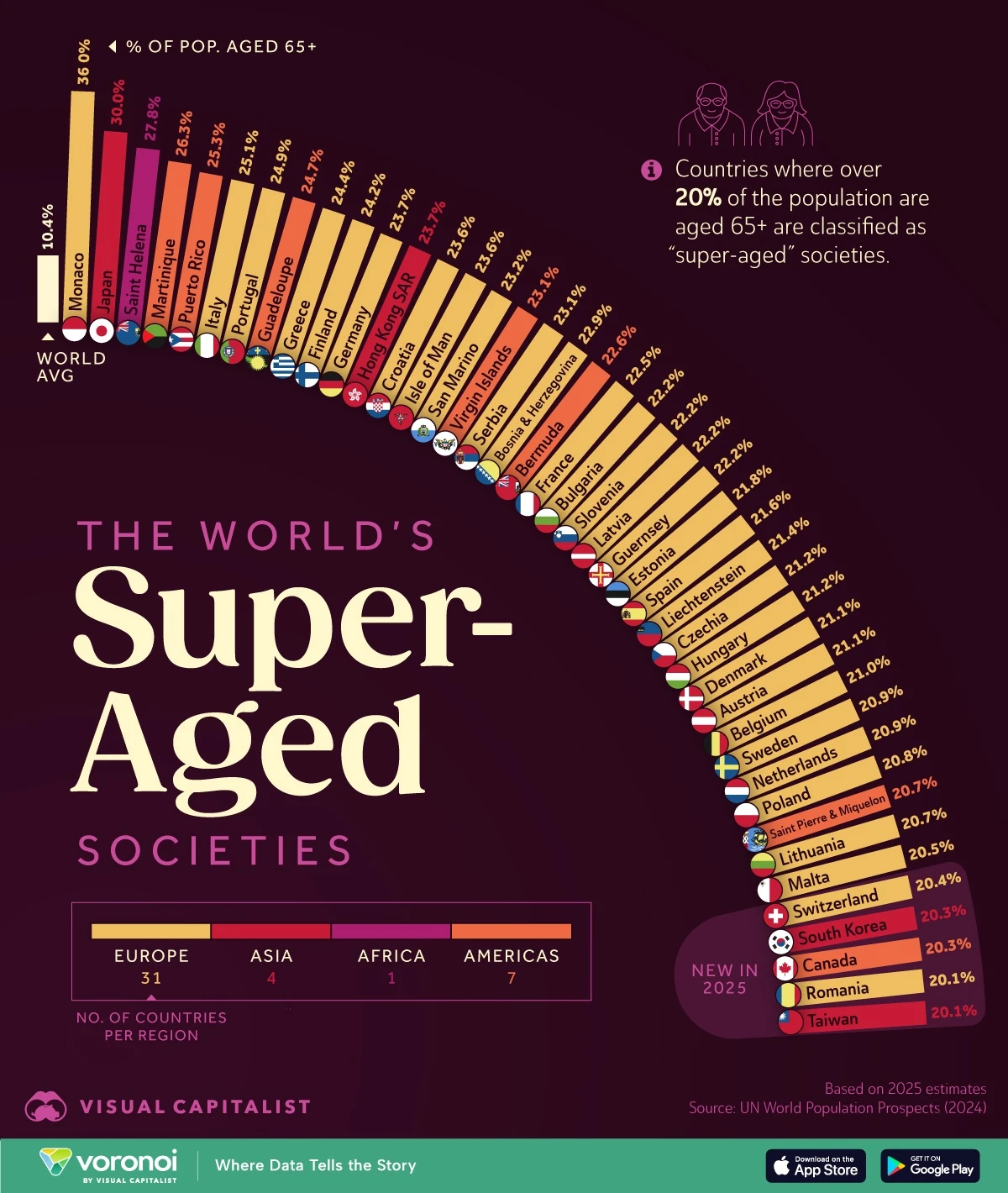 What we’re showing This graphic highlights the world’s “super-aged” societies, which the UN defines as those with over 20% of the population being aged 65+…