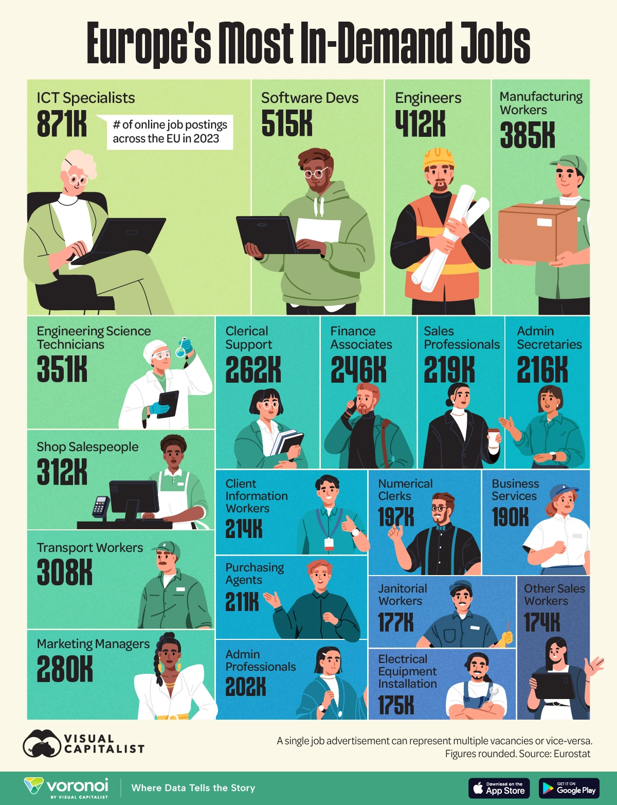 What We’re Showing: This chart shows the top 20 most in-demand jobs in Europe, as sourced from a year’s worth of online job advertisements in 2023. D…