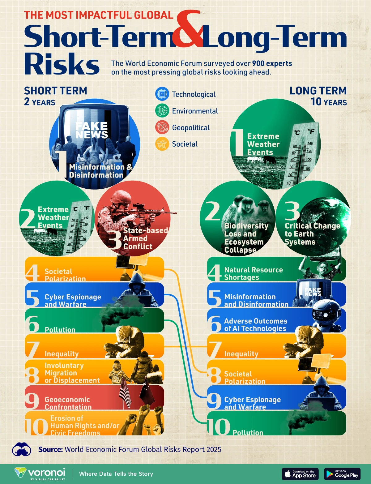 voronoiκ° μΈκ³κ²½μ ν¬λΌ(WEF/World Economic Forum)μ κΈλ‘λ² λ¦¬μ€ν¬ 리ν¬νΈ 2025(World Economic Forum Global Risks Report 2025)λ₯Ό λ°νμΌλ‘ μ 리ν μ΄ μΈν¬κ·Έλν½μλ μΈκ³μ 900λͺ