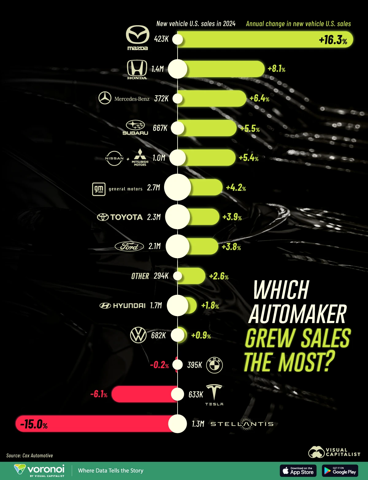 What We're Showing This chart shows the annual change in new vehicle sales for major automakers in the U.S. and the number of vehicles they sold in 2024. T…