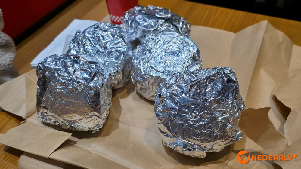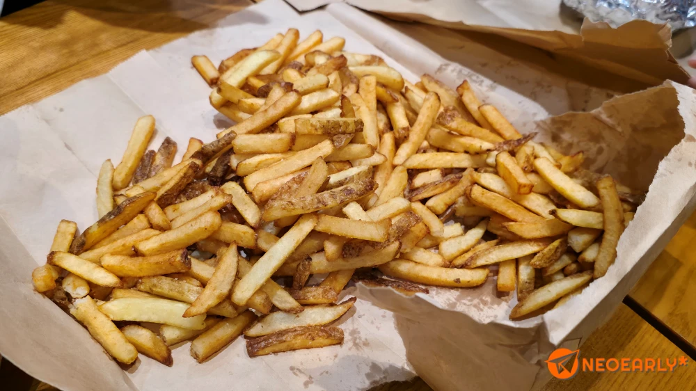 ์—ฌ๋Ÿฌ ์ง์›์ด ๋Š์ž„์—†์ด ๋ฒ„๊ฑฐ๋ฅผ ์กฐํ•ฉํ•˜๊ณ  ์žˆ๊ณ , ํ•œ์ชฝ์—์„  ์…ฐ์ดํฌ๋ฅผ ๋‚ด์ฃผ๋Š”๋ฐ ์Œ์‹์„ ๋ฐ›์•„์•ผ ๋งค์žฅ ๋ฐ–์— ์•‰์„ ์ˆ˜ ์žˆ๋Š” ๊ณต๊ฐ„์— ๋“ค์–ด๊ฐˆ ์ˆ˜ ์žˆ์–ด์„œ ์ž ์‹œ ๊ธฐ๋‹ค๋ ค ๋ดค์Šต๋‹ˆ๋‹ค. ์Œ์‹์€ ๋‹คํ–‰์Šค๋Ÿฝ๊ฒŒ๋„ ํŒจ์ŠคํŠธํ‘ธ๋“œ ๋งค์žฅ๋‹ต๊ฒŒ ๋นจ๋ฆฌ ๋‚˜์˜ค๋Š” ํŽธ์ด์—ˆ์Šต๋‹ˆ๋‹ค. ์ด๋Ÿฐ์ €๋Ÿฐ ์–˜๊ธฐ ์ž ๊น ๋‚˜๋ˆ„๋‹ค ๋ณด๋‹ˆ ์…ฐ์ดํฌ๋ถ€ํ„ฐ ๋‚˜์˜ค๊ธฐ์— ๋“ค๊ณ  ์ž๋ฆฌ๋ฅผ ์žก์•˜๋Š”๋ฐ์š”. ๋‹จ ํ•œ ๊ฐœ์˜ ํ”„๋ผ์ด๊ฐ€ ์ด ์ •๋„๋กœ ์—„์ฒญ๋‚œ ์–‘์ด์—ˆ๊ณ , ๋ฒ„๊ฑฐ๋Š” ์€์ƒ‰ ํฌ์ผ์— ์ˆจ์–ด ์žˆ๋”๊ตฐ์š”. ์ด๋ฏธ ๋‹ค๋…€์˜ค์‹  ๋ถ„๋“ค์˜ ํ›„๊ธฐ๋ฅผ ๋ณด๋‹ˆ ๋ฒ„๊ฑฐ ์ž์ฒด๋Š” ์ฐŒ๊ทธ๋Ÿฌ์ง„ ๋ชจ์Šต์ด๋˜๋ฐ ์ œ๊ฐ€ ๋ฐ›์•„ ๋“  ๊ฒƒ๋„ ๋งˆ์ฐฌ๊ฐ€์ง€์˜€์Šต๋‹ˆ๋‹ค. ๋ฒ„๊ฑฐ๋ฅผ ์กฐ๋ฆฝํ•˜๊ณ  ํฌ์ผ๋กœ ์Œ€ ๋•Œ ๋ฒˆ ์‚ฌ์ด์˜ ๋‚ด์šฉ๋ฌผ์ด ํŠ€์–ด๋‚˜๊ฐ€์ง€ ์•Š๊ฒŒ ํž˜์„ ๊ฐ€ํ•ด์„œ ๊ทธ๋Ÿฐ ๊ฑฐ๊ฒ ์ฃ ? ๋จน๋Š” ๋ฐ๋Š” ์•„๋ฌด ๋ฌธ์ œ๊ฐ€ ์—†์ง€๋งŒ, ์ฒซ์ธ์ƒ์€ ์‚ด์ง ๋ณ„๋กœ.ใ…Ž