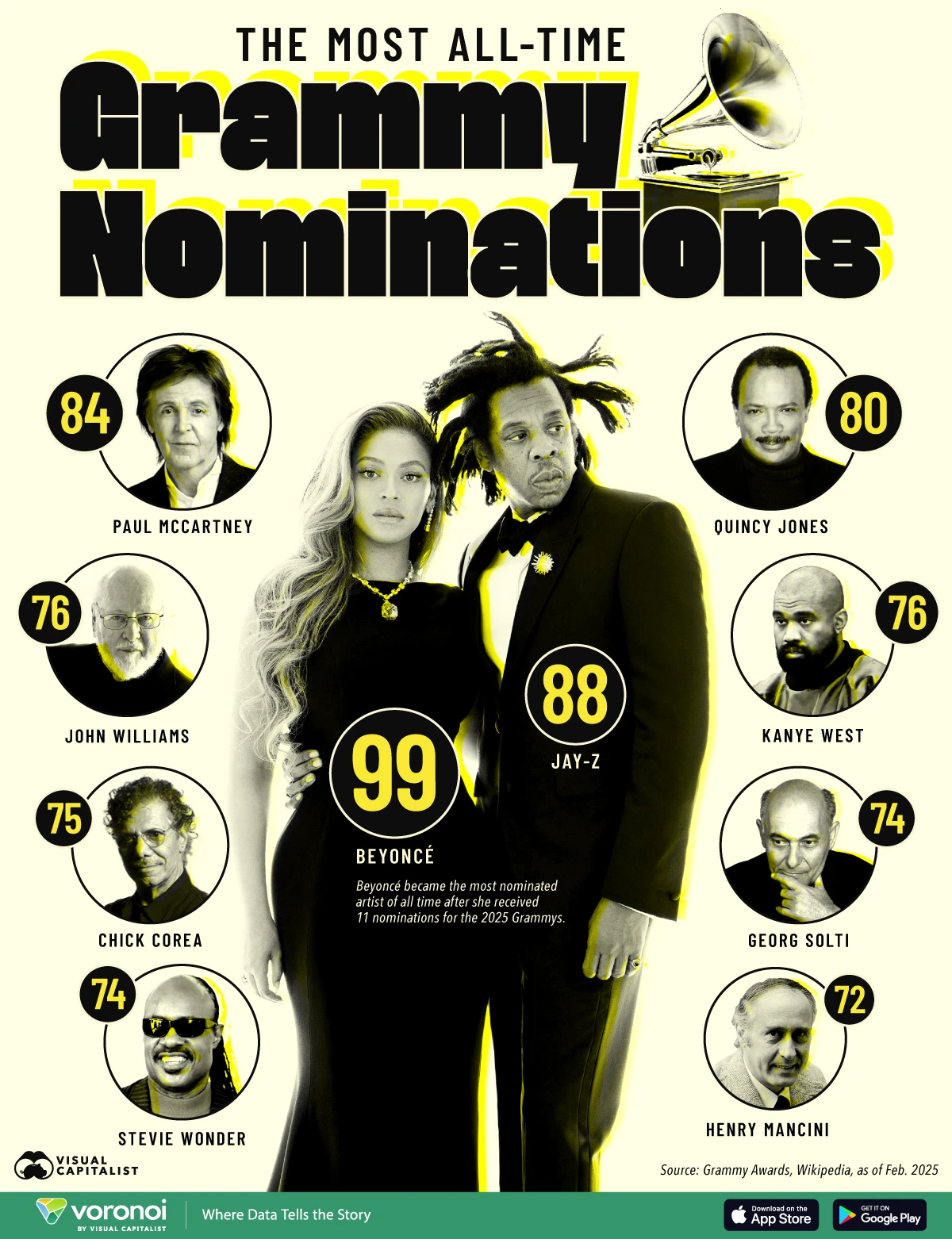 What We're Showing The most Grammy-nominated artists of all-time, as of February 2025. Data comes from the Grammy Awards and Wikipedia . Beyoncé Is Th…