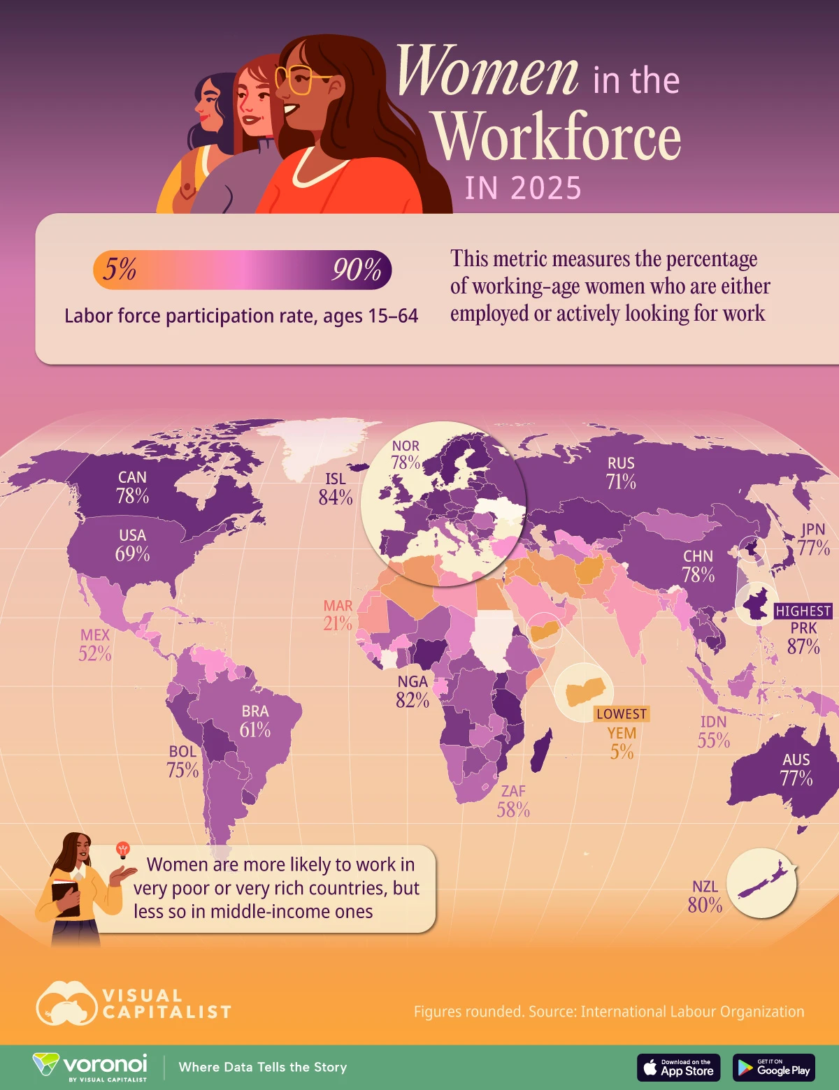 2025๋ ์ฌ์ฑ ๋ ธ๋ ์ฐธ์ฌ์จ์ด ๋์ vs ๋ฎ์ ๊ตญ๊ฐ by voronoiapp.com